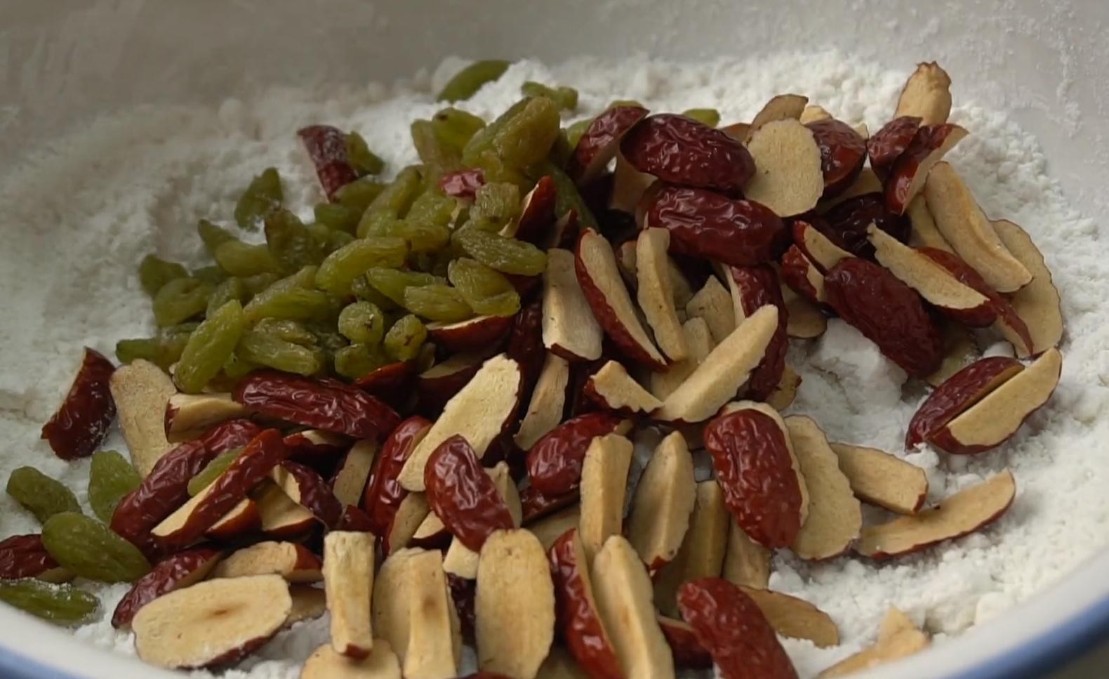 3,准备好一把大枣和葡萄干犯放入碗中,加入一勺面粉抓一抓,再用流水冲洗干净,面粉有很好的吸附性可以有效地带走表面的异物。大枣切成小块放入糯米团盆中充分抓拌均匀。