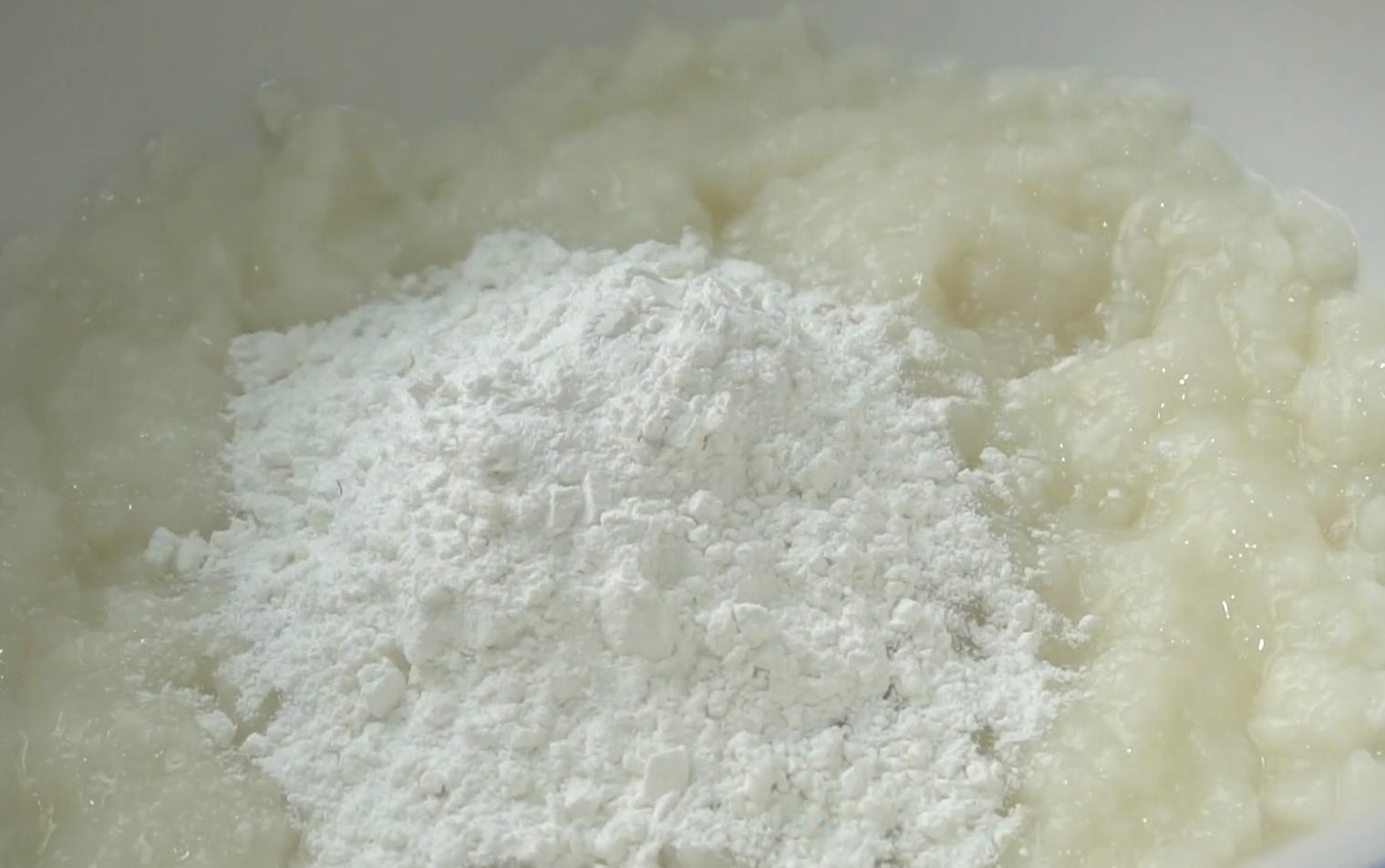 2,蒸好的山药倒入盆中,加入一勺白糖,用勺子压成细腻的山药泥,趁热分次加入大约500克的糯米粉,用筷子搅拌混合均匀,晾至温热后用手搓一搓,这样可以使山药和糯米充分融合。