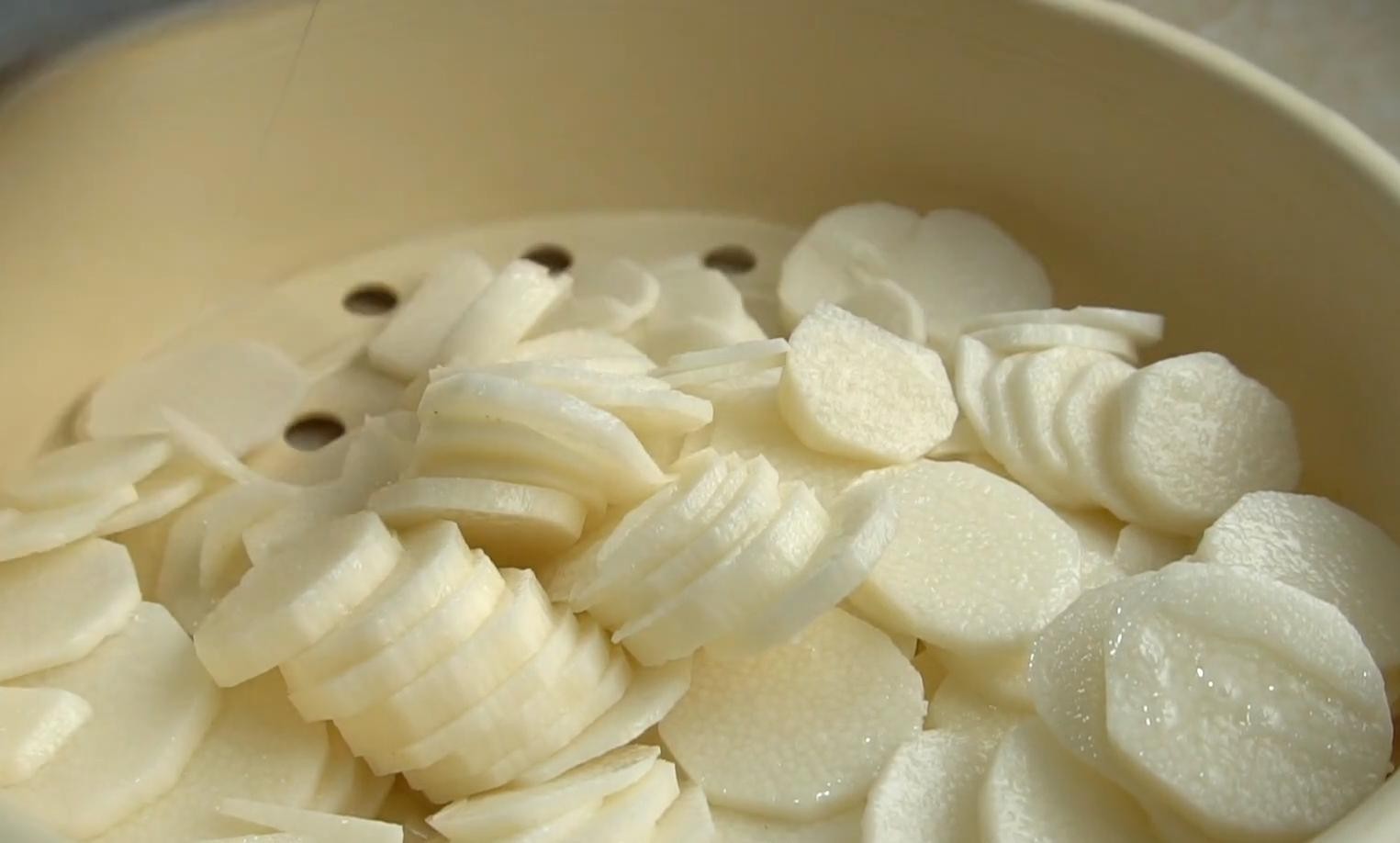 1,准备好一根山药,戴上手套去皮,切成薄片,放入蒸锅蒸15分钟蒸熟。山药去皮的时候记得带上手套避免过敏手痒。