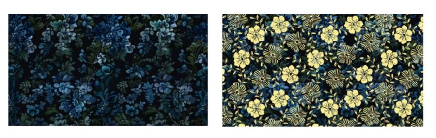 《数绘花境》面料设计灵感来源于非洲繁茂枝叶的生命力,使用传统蜡染与AI生成技术结合的方式,打造全新的产品风格,传递经典文化数字化的独特魅力。产品采用圆网渐变印花工艺,一次性双面印制,取材清新自然的蜡布图案为炎热气候里的非洲消费者带来视觉上的舒适,明亮金粉效果的叠加,极大提升产品的视觉效果,使之绽放在靛蓝色幽深的画布上。产品使用100%纯棉面料,吸湿透气,能有效应对非洲地区高温气候,极大提升穿着舒适度,满足当地消费者对日常穿着的高要求。