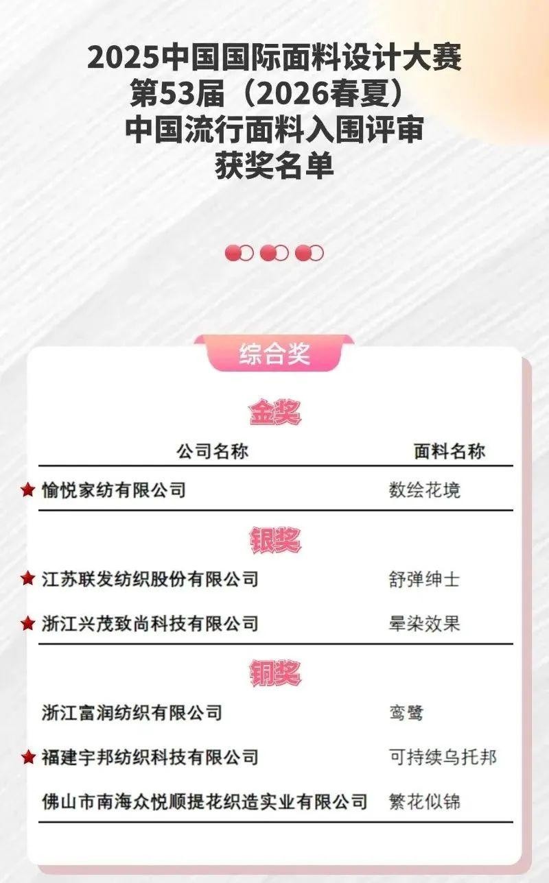 愉悦家纺荣获2025中国国际面料设计大赛唯一金奖