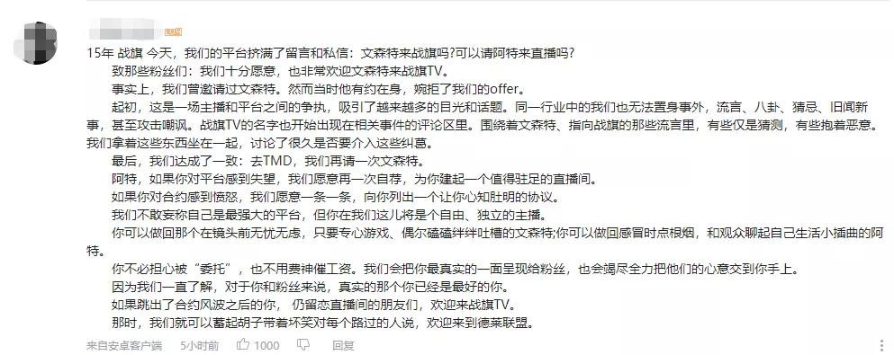 文森特也透露其实并不是本意上想离开,而是战旗准备转型了,主播都已经解约了。(这个可以参考龙珠直播转型,旭旭宝宝离开)