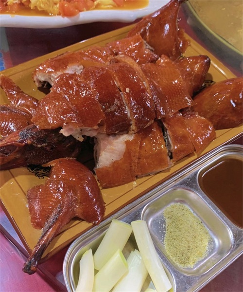 ③宜良烤鸭:宜良烤鸭,昆明市宜良县经典的地方传统名肴,宜良烤鸭选用当地特有的小麻鸭,制作考究,成品有着肥瘦相宜,皮酥脆,内香嫩,光亮油润,色泽红艳,清香离骨,地方风味显著。