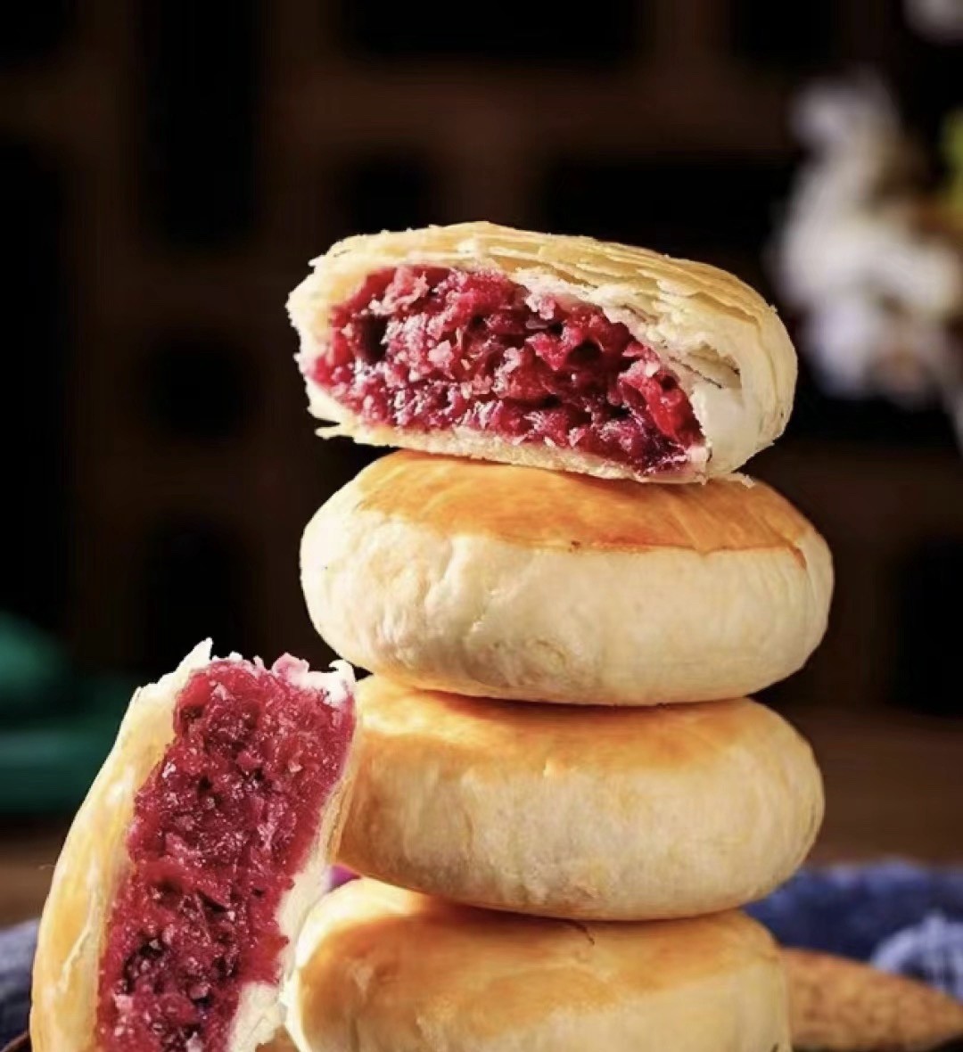 ②鲜花饼:花都春城,四季鲜花开不败。昆明人对鲜花的喜爱体现到舌尖上。鲜花饼是用可以食用的玫瑰花入馅制成的一种酥饼,能吃到沁人心脾的花香。
