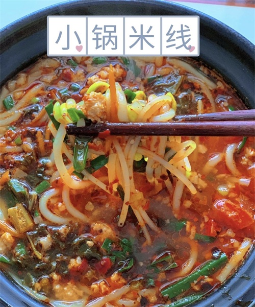 ⑦小锅米线:米线是昆明人的最爱,吃法中首屈一指的当属小锅米线。铮亮的小铜锅,用大火烧得灼热滚烫;倒入浓郁高汤,撒上肥瘦的肉末,再放入米线,腌菜,白菜,韭菜等主料,添上盐,油辣椒。一碗汤鲜味美,还带着些许辣意的极致滋味,就这样在口中点亮。