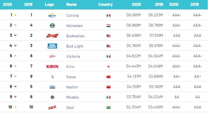 2020全球啤酒排名:墨西哥啤酒排第一,中国两大品牌冲进前十