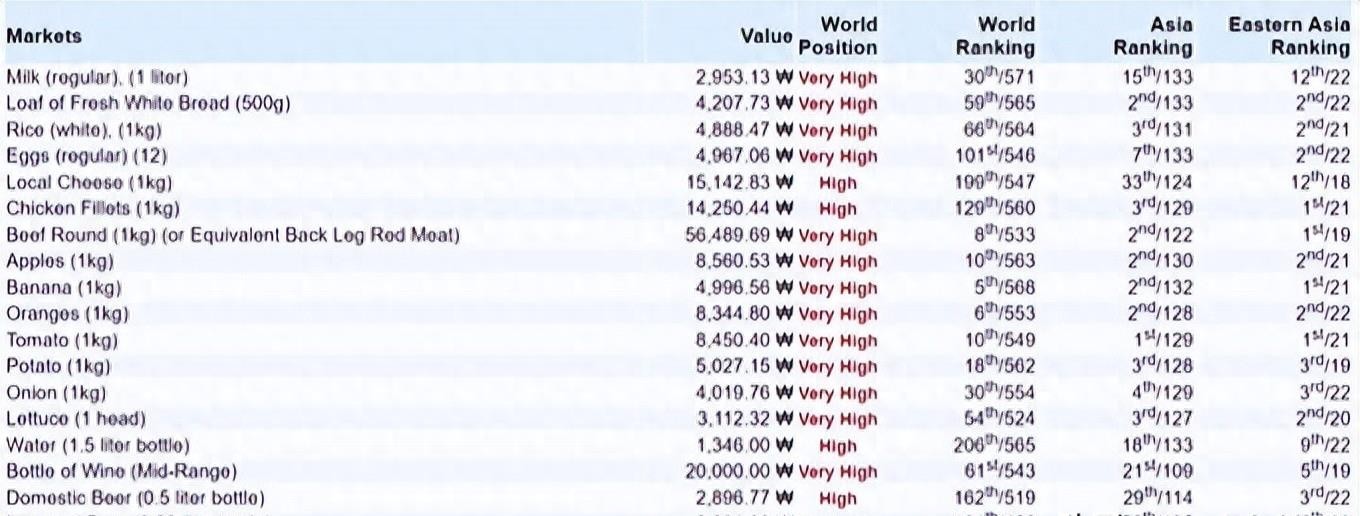 据全球物价调查网站Numbeo的数据显示,韩国的物价水平被评为“Very high”以及“High”,其中香蕉、橙子、苹果、西红柿和生菜等水果和