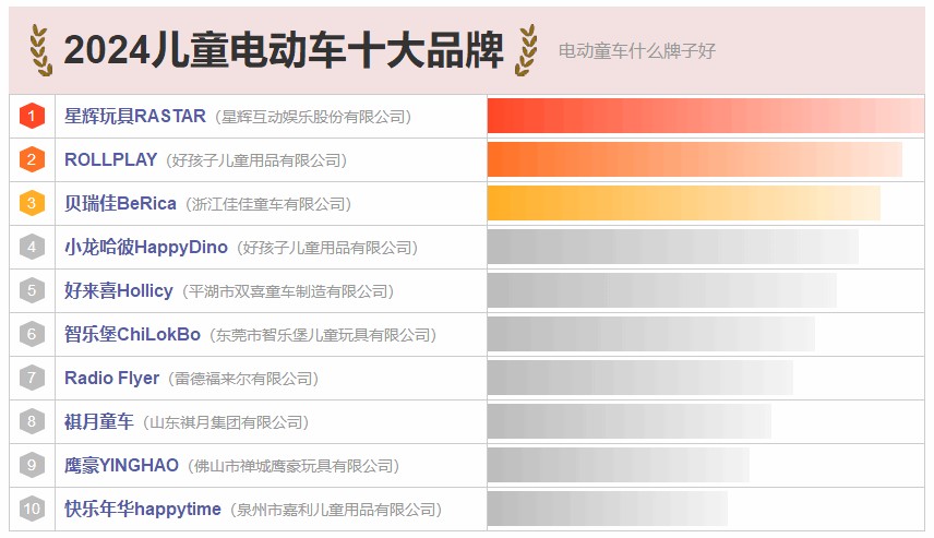 在如今的社会,电动车成为孩子们的新宠,它不仅是一种给孩子带来欢乐的玩具,还是锻炼孩子动手能力和协调能力的好帮手。那么儿童电动车什么牌子好?下面,小编为大家分享儿童电动车十大品牌排行榜,包括星辉玩具RASTAR、ROLLPLAY、贝瑞佳BeRica、小龙哈彼HappyDino、好来喜Hollicy、智乐堡ChiLokBo、Radio Flyer、祺月童车、鹰豪YINGHAO、快乐年华happytime等。该榜单由CNPP品牌榜中榜大数据研究院和CN10排排榜技术研究院专业测评而得出,一起来了解下吧。