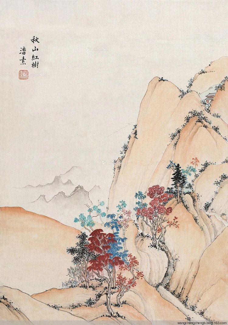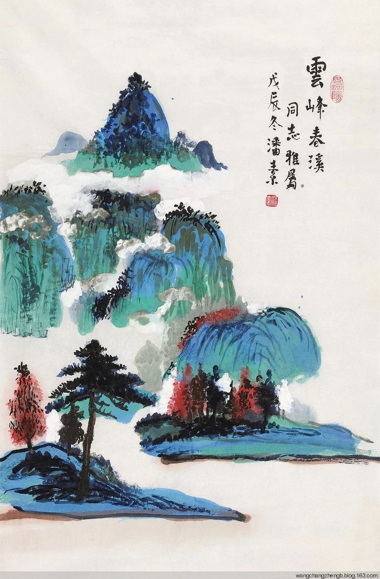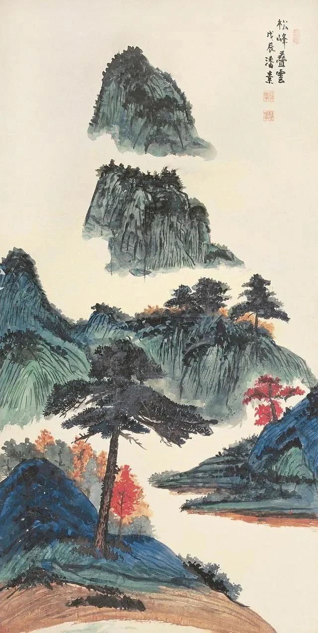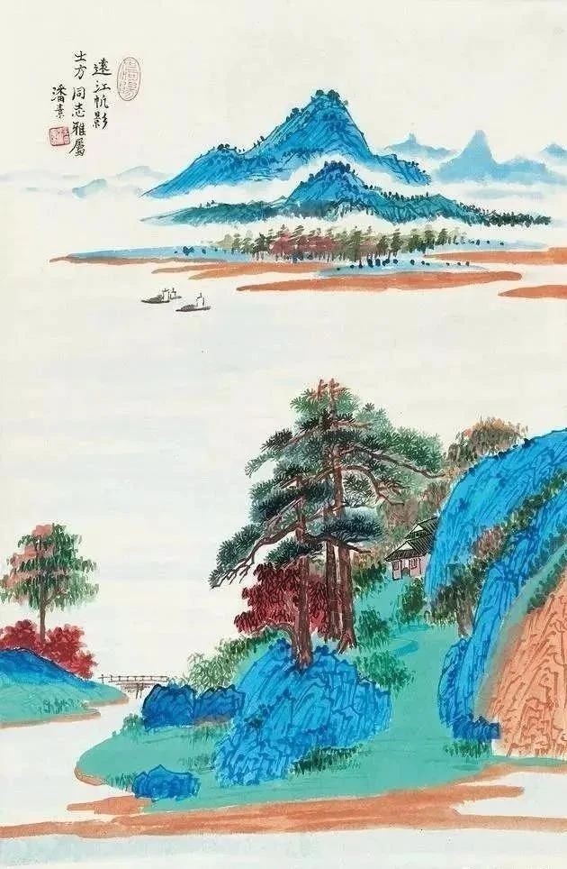 潘素的青绿山水常常采用平远法构图,层次分明,空间感强,工细严谨,色彩丰富,极富感染力。潘素常用石青石绿错落作画,画面加错,虚实相生,具有节奏感,逸趣横生。