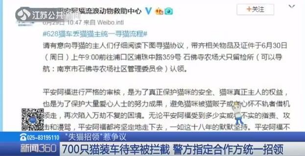 【700只猫装车待宰被拦截 警方指定合作方统一招领】