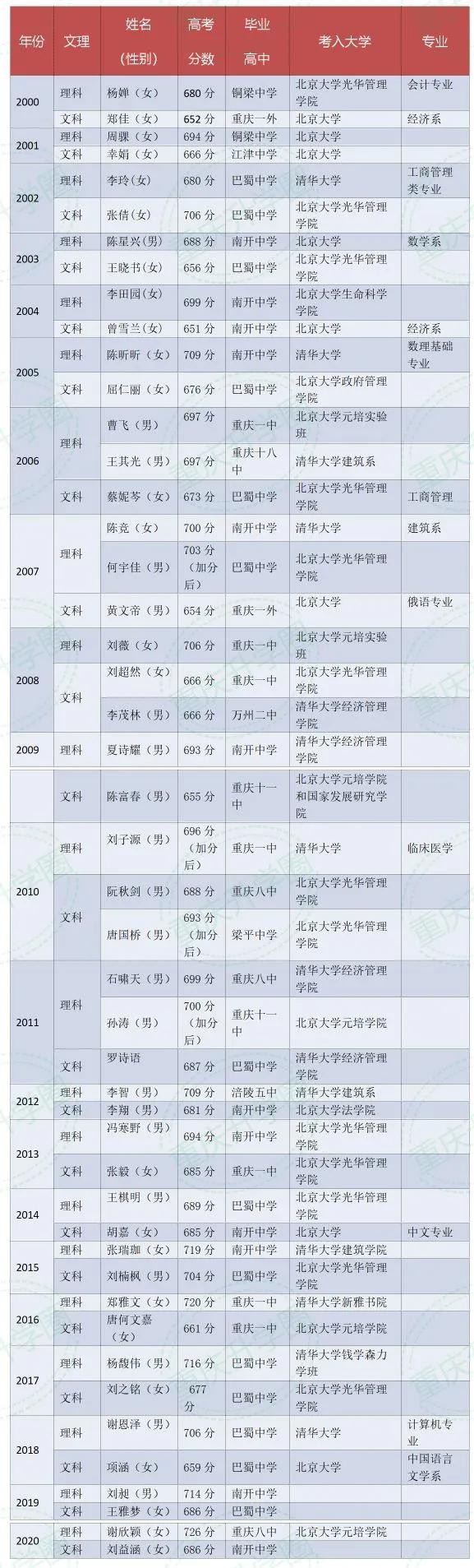 2000-2020年重庆市高考状元