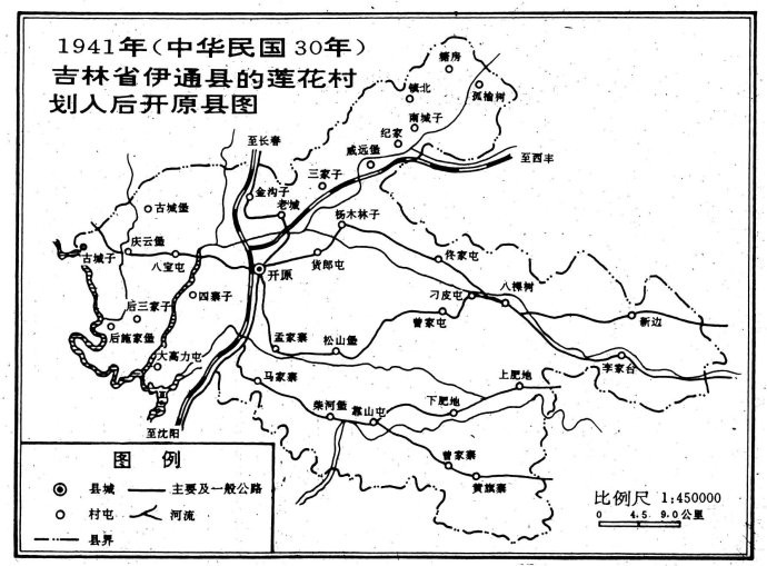 伪满洲国时期,伪康德八年(民国三十年即1941年),日伪当局把伊通县的莲花街、孤榆树、糖房、砚台、镇北、东屯、东北、石龙、青石、保安、王家店等村划入开原县,开原地图像蘑菇云生长一样,呈玉如意状,反而向伊通方向生长突起了。见图四。