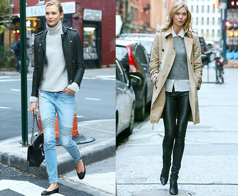 果然是简约而不简单的经典穿法!首先是外套look,短皮衣或者风衣都是百搭不过时的经典款式,内搭浅色毛衫使得整体颜色不会突兀。若是随意休闲风,则搭配不花哨的牛仔裤;若是帅气机车风,则搭配利落皮裤。衣长、裤长都控制得刚刚好,不会冗长臃肿而显拖沓。