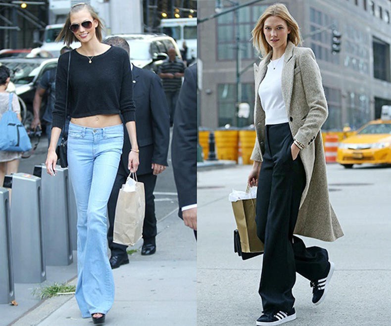 除了直筒裤,本身就已经拥有逆天大长腿的KK也不忘利用阔腿喇叭裤再秀一把腿。视觉上延长了下半身的长度,裤子材质的不同又打造出不同的风格,有休闲又有运动。色彩方面仍然是以简约为主,全身服装加在一起没有超过三个颜色,看起来KK并不喜欢花哨或者女生气息足的风格,而是喜欢中性、简约的风格,身高较高的女生可以尝试。