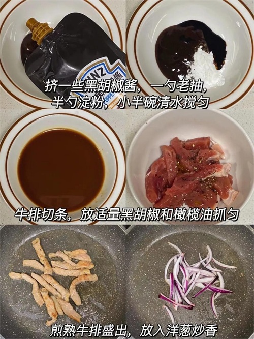 做法:牛排切条,放适量橄榄油和黑胡椒抓匀~