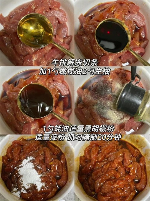 做法:牛排解冻切条,加1勺橄榄油+2勺生抽+1勺蚝油+适量黑胡椒粉+适量淀粉,抓匀腌制20分钟~