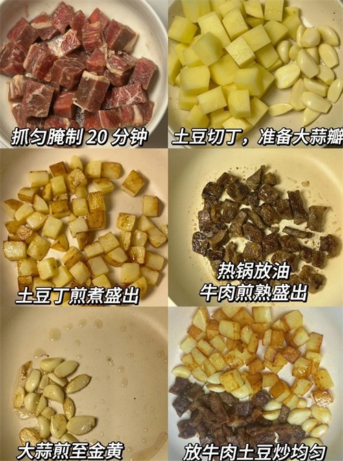 土豆切丁,准备大蒜瓣,土豆丁煎煮盛出~