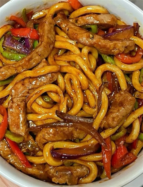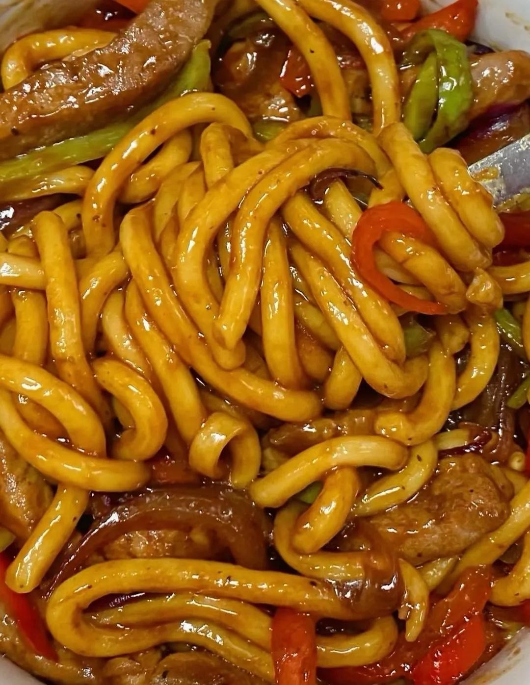放入煮熟的乌冬面和牛排,淋上酱汁,翻炒均匀后,收汁出锅~