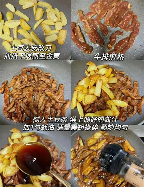 牛排煎熟,倒入土豆条,淋上调好的酱汁~