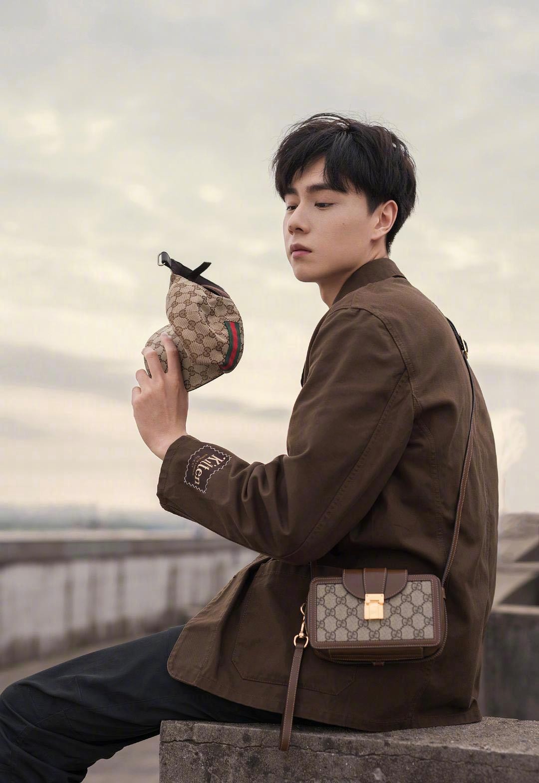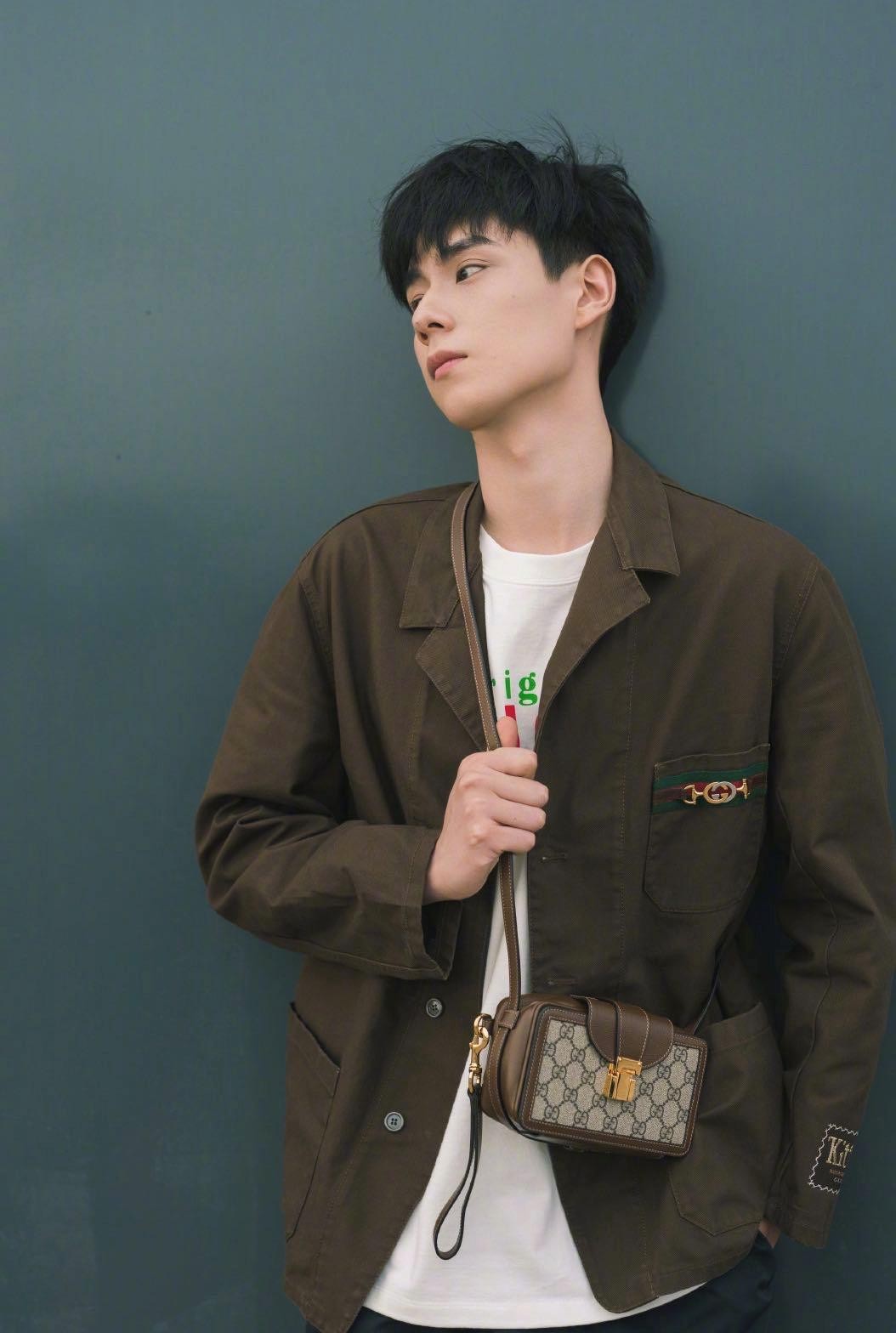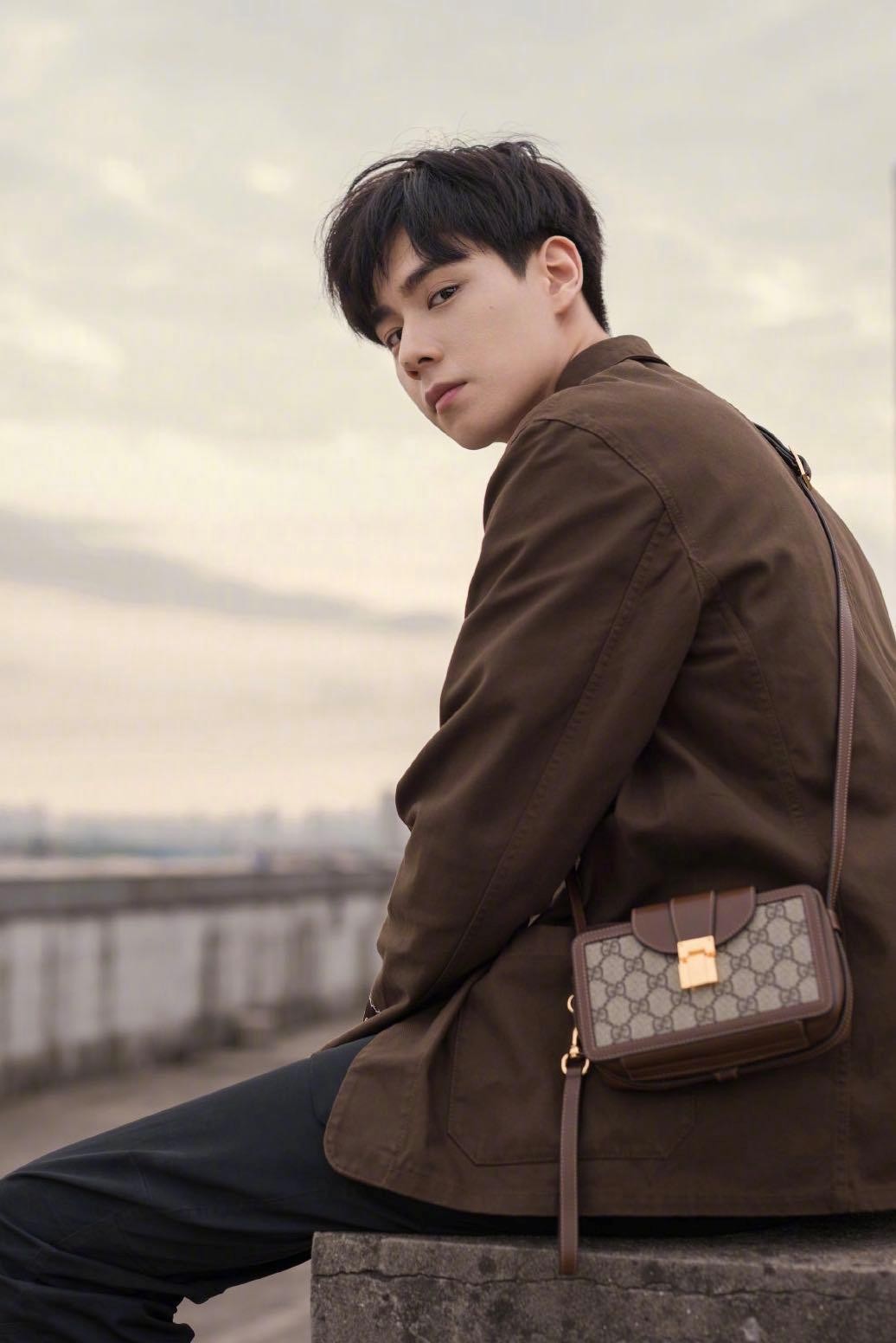 胡一天GUCCI官方宣传照,深咖色外套内搭T恤,尽显阳光气息