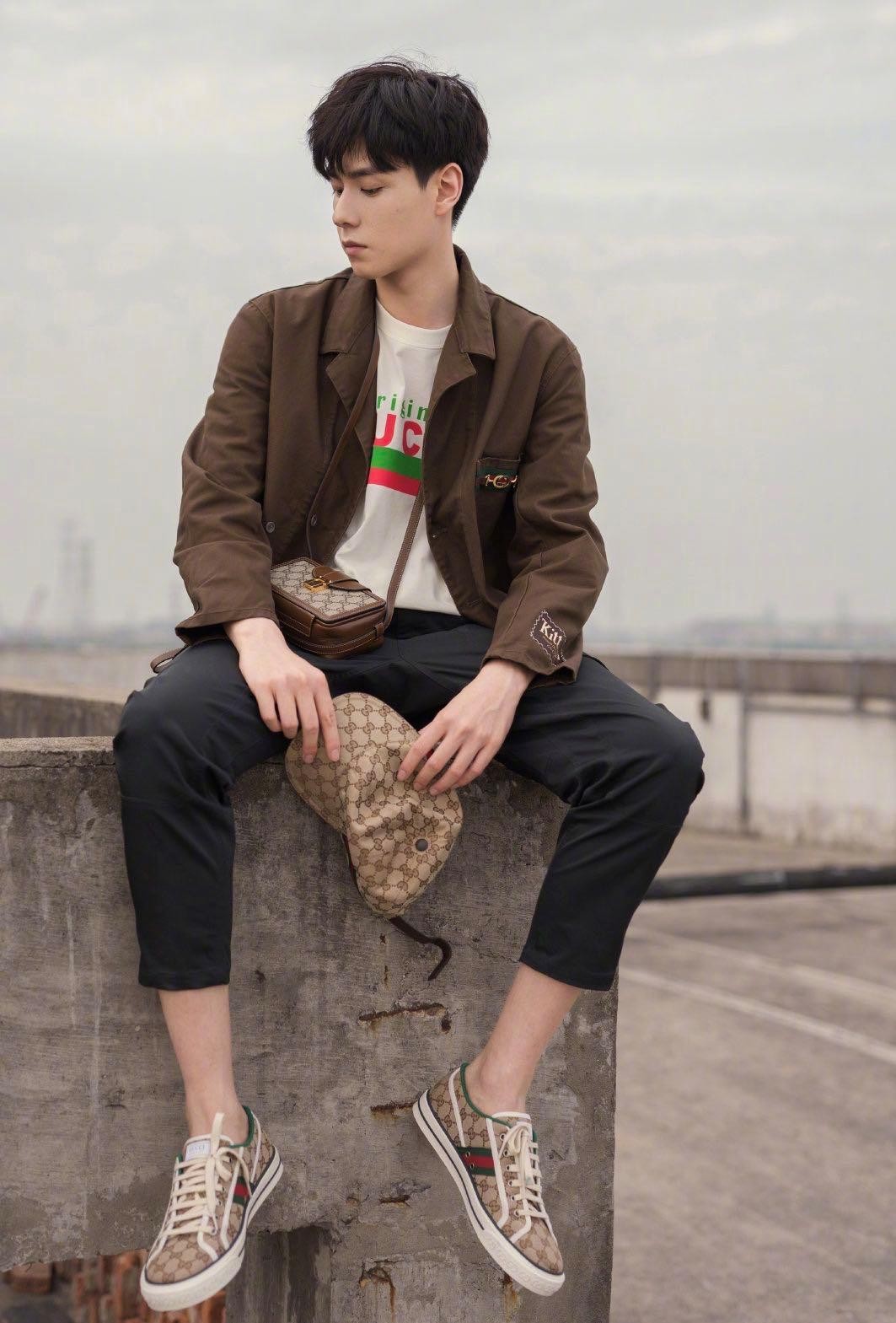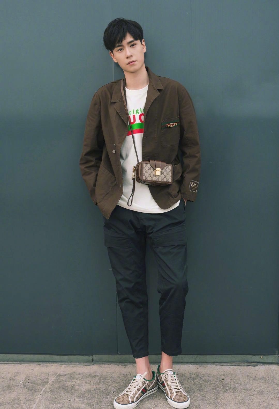 除了帽子,胡一天还背上一个GUCCIDE经典小包包,方形的设计尽显复古感,可斜跨可单肩,背着它的胡一天依靠在墙上,给人一种在等在女朋友出门的感觉,整个造型在色彩上的搭配非常的和谐,不会显得太沉重。