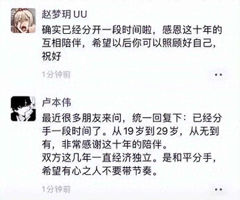 卢本伟赵梦玥微信官宣分手,十年爱情长跑终未修成正果