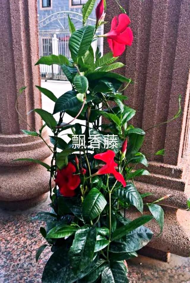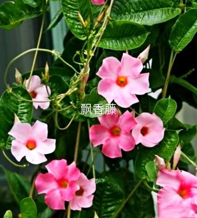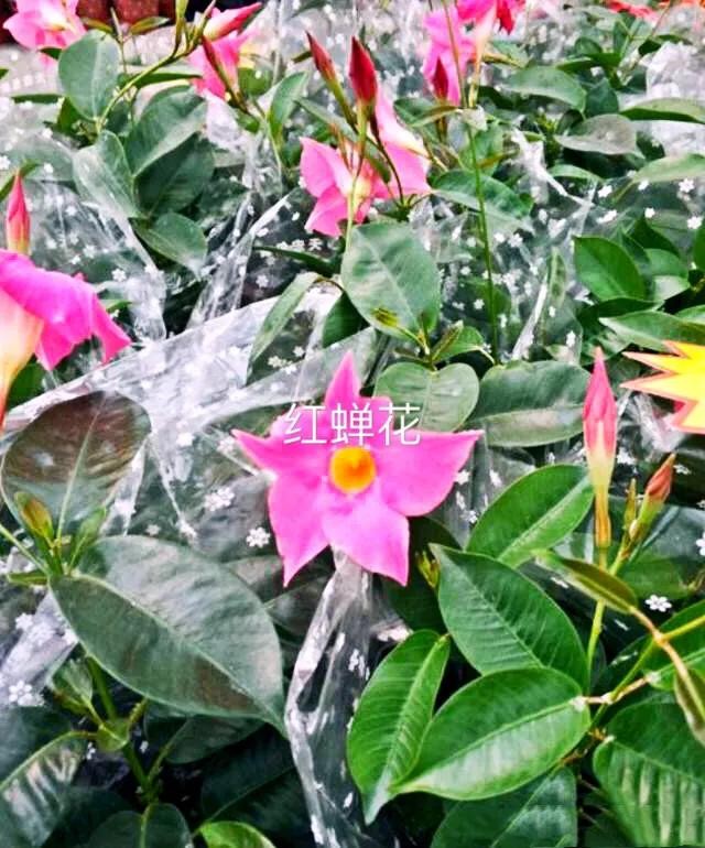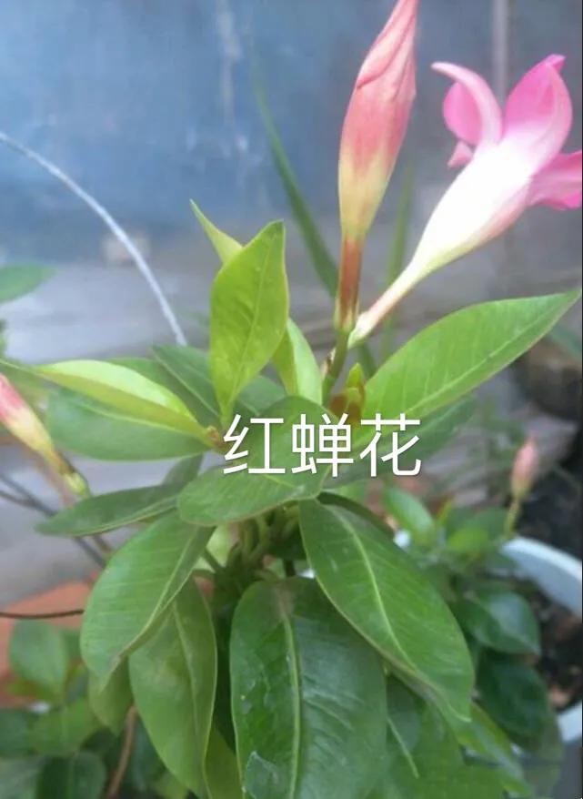 红蝉花 别名:红花文藤、双腺藤。夹竹桃科飘香藤属常绿藤本灌木。全株有白色乳汁。叶对生,或3-4叶轮生,全缘,长卵圆形。花腋生,花冠5裂桃红色,花为红色、桃红色、橙红色、粉红色等。花期主要在夏秋两季。