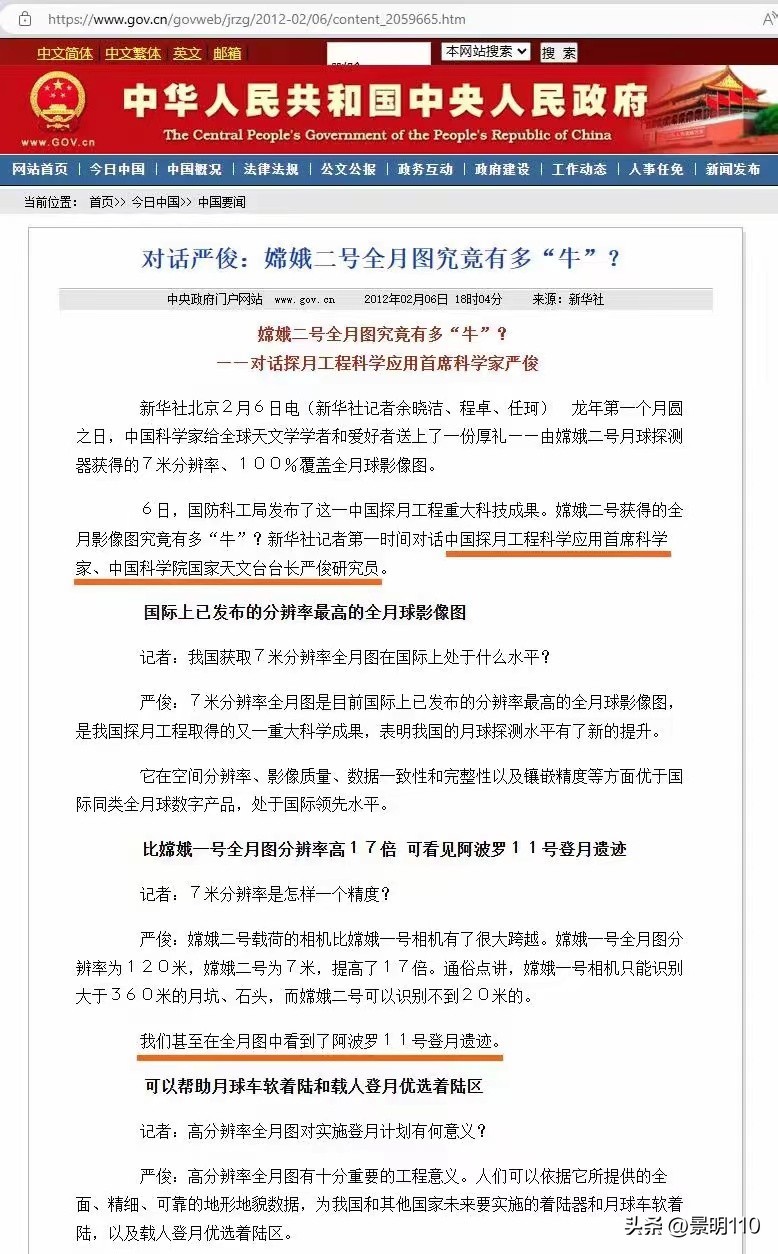 还有我国探月工程科学应用首席科学家,中国科学院国家天文台台长严俊研究员在2012年就说过:我们甚至在全月图中看到了阿波罗11号登月遗迹。