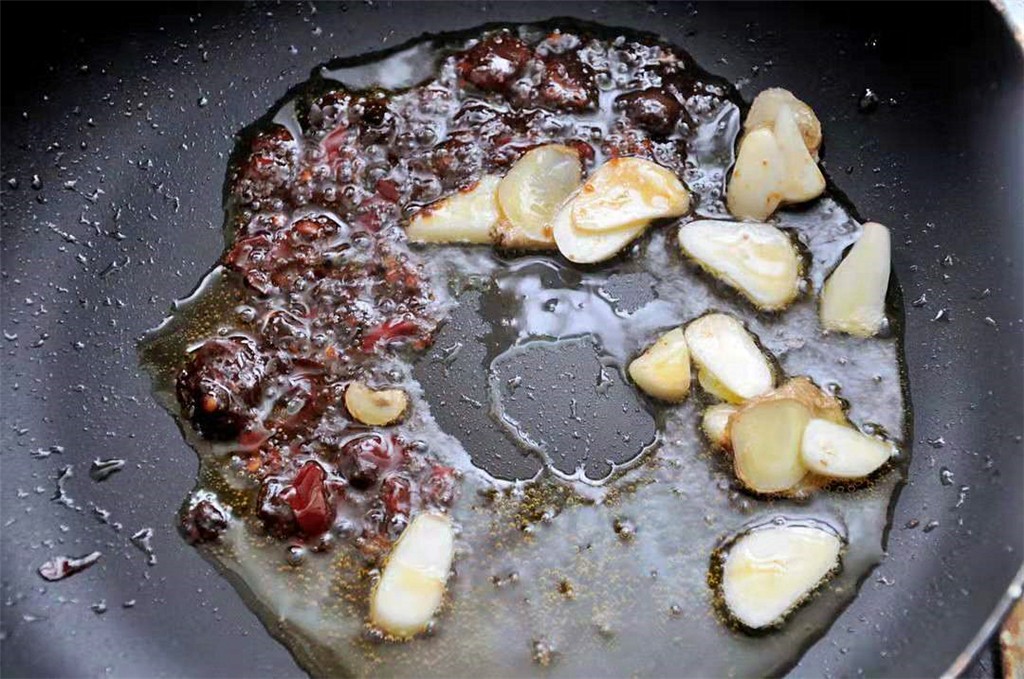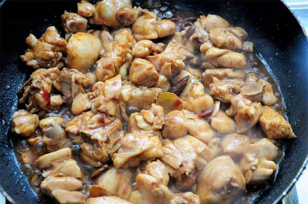 第四步,炒锅加热,锅里放入适量的食用油,把豆瓣酱和黄豆酱放进锅里,小火炒出红油,把蒜片姜片放进去,煸炒出香味,放入腌好的鸡块,翻炒均匀,放八角,桂皮,冰糖,老抽,大火翻炒,炒到鸡肉发紧上色。
