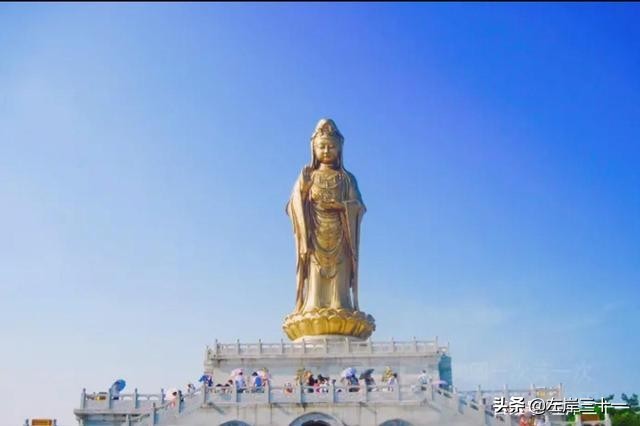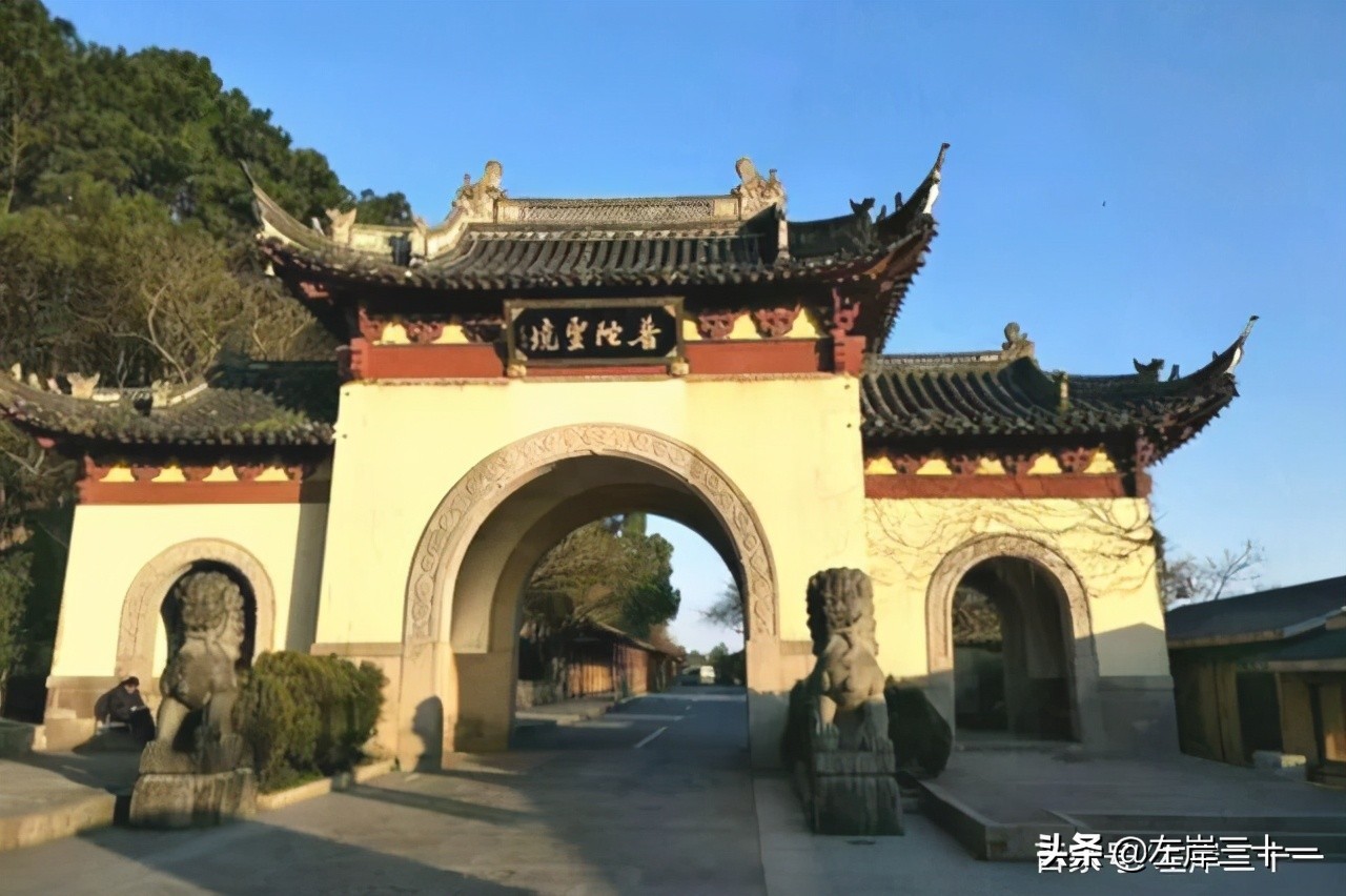 普陀山是浙江省舟山群岛中的一个小岛,四面环海,狭长形,似苍龙卧海。五代后梁时期,日本高僧慧锷大师从五台山清凉寺请观音像乘船归国,到了舟山海面上,就遭遇狂风大浪,数次前行都无法如愿,大家都认为观音不肯东渡,于是就把观音圣像供奉于普陀山的潮音洞,称为“不肯去观音”。从此普陀山成为观音菩萨的道场,佛教从此在这里兴起。普陀山最引人注目的是南天门旁面朝大海,与洛伽山隔海相望的观音菩萨立佛,佛像雕刻精巧、线条流畅、气魄宏大、金光闪闪,是普陀山的标志性建筑。普陀山上有很多寺庙、院庵。最有名的三个是普济寺、法雨寺和慧济寺(又名佛顶山寺)。