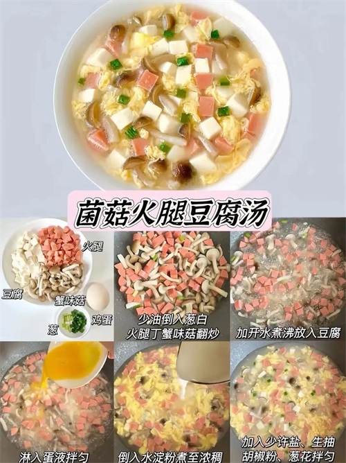 菌菇的鲜美、火腿的醇香与豆腐的嫩滑完美融合在一起,形成了一道既美味又健康的素食佳肴。虽然加入了火腿作为点缀,但适量食用并不会影响减肥效果。菌菇和豆腐都是低卡高蛋白的优质食材,非常适合减肥期间食用。这道汤品不仅满足了味蕾的需求,更让身体得到了充分的滋养。