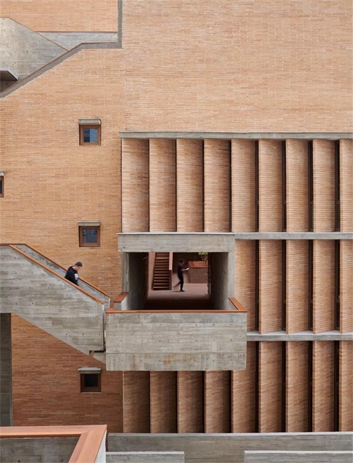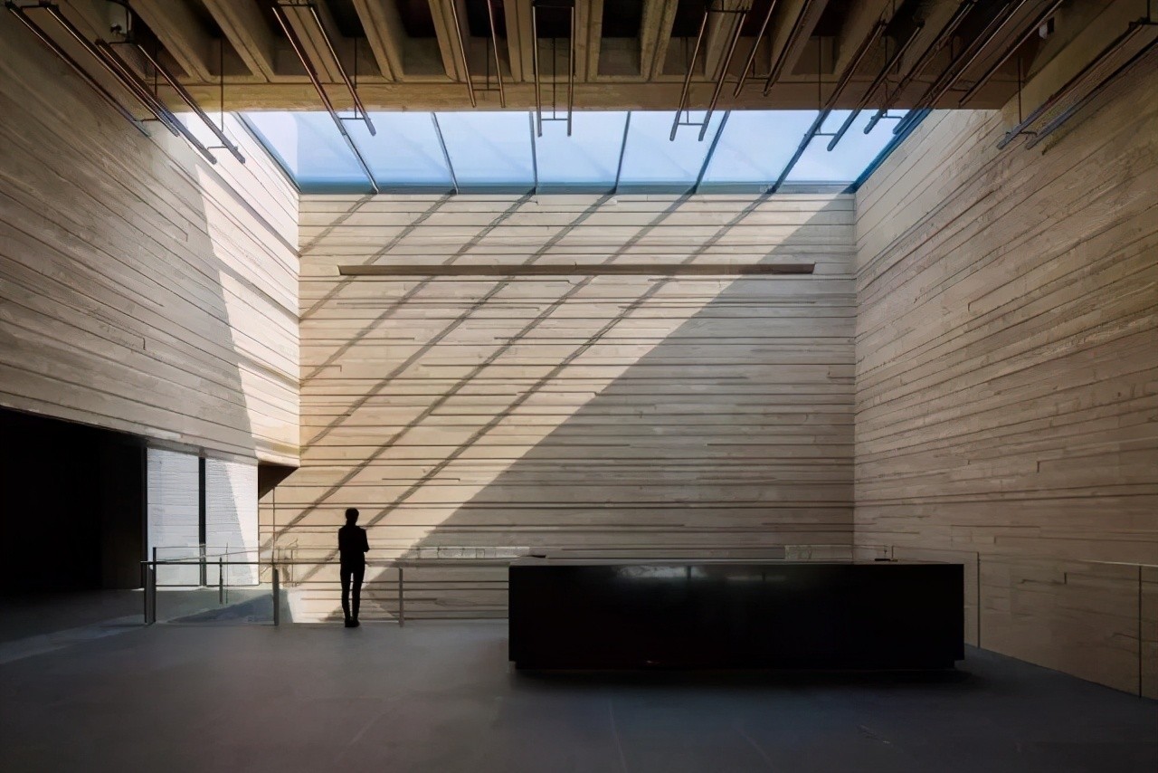长江美术馆 从一块“砖”开始,从城市街道起,向内,走向建筑内街“庭院”,四层高的围合内院中仰望天空;向里,走向建筑的锚固点“光筒”,凝聚情绪;向上,走向聚集点“井格展厅”,匀质光线聚集展品;向外,细观米黄色砖体构造,触摸回忆。