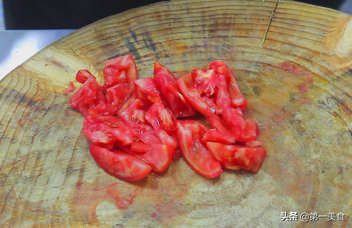 然后捞出西红柿,撕去外皮切成小块,放在盆里备用。