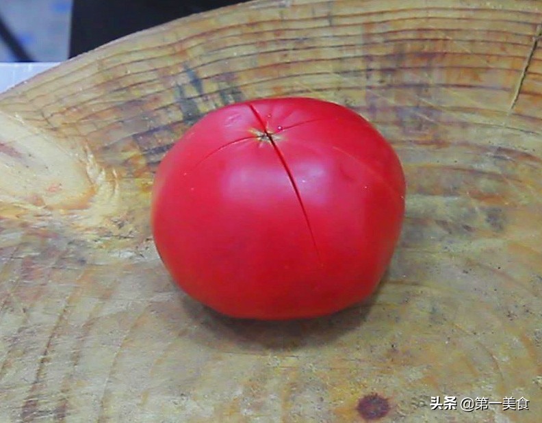 准备一个西红柿,在上面切成十字花刀,方便撕去外皮。