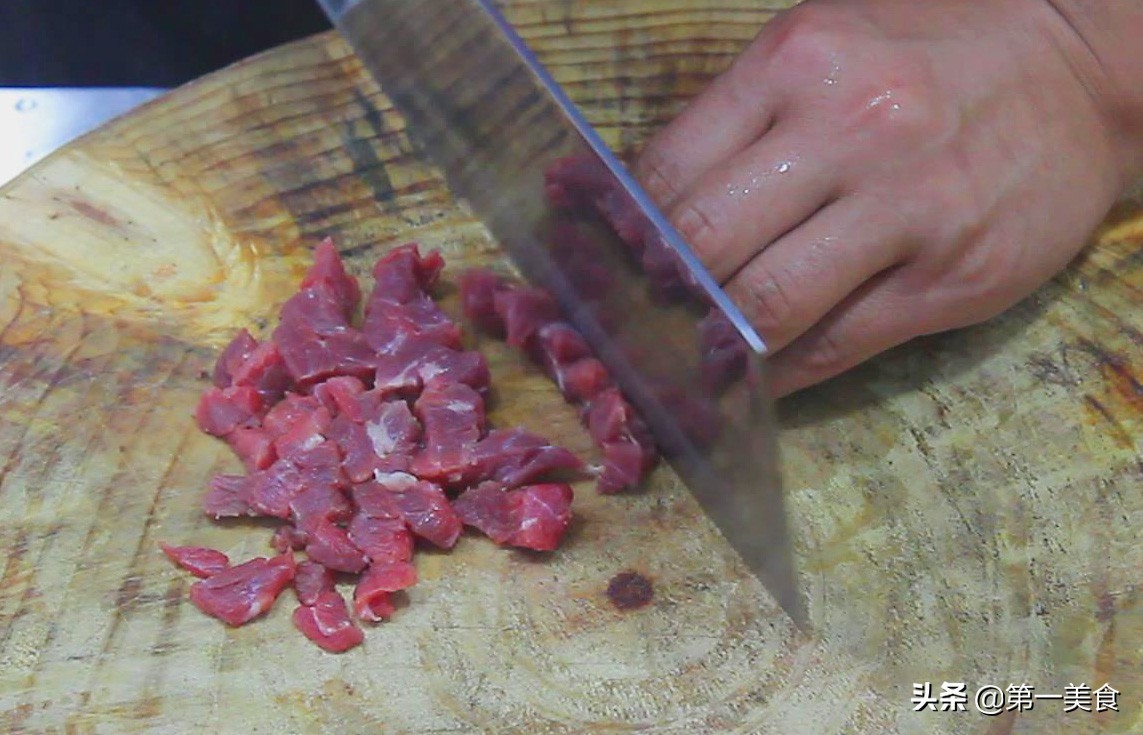 准备牛肉50克,先切成厚片,再改刀切成小牛肉丁,放在碗里备用。