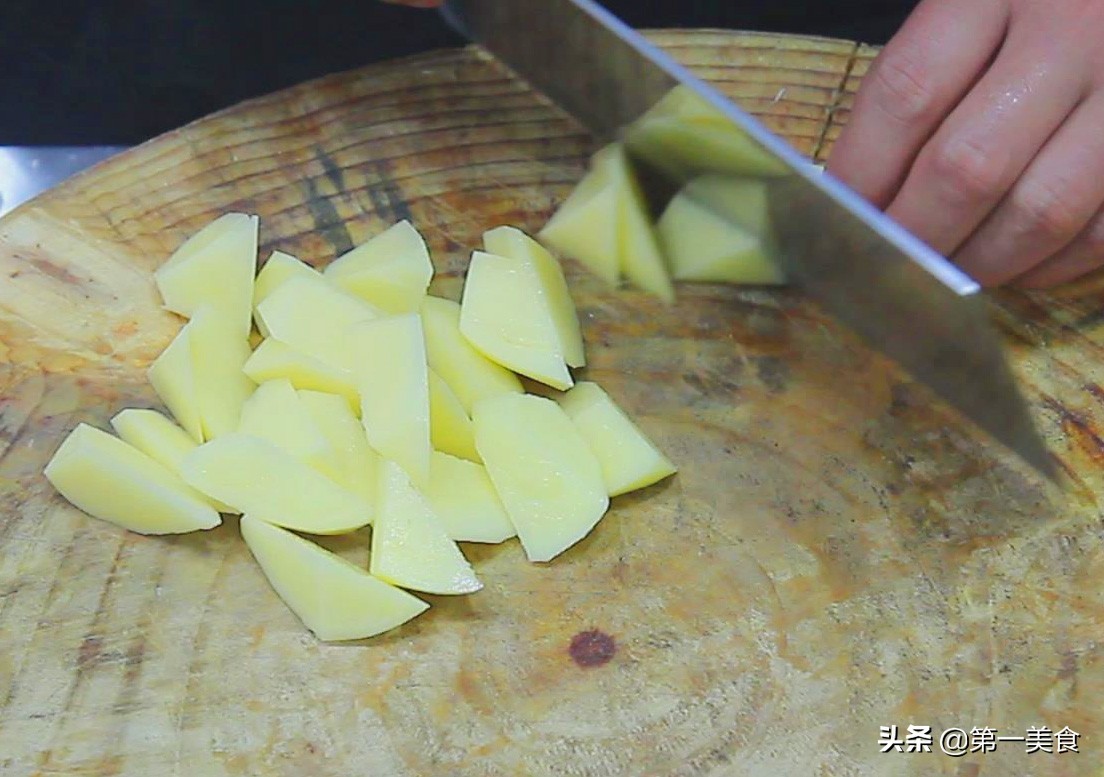 准备土豆一个,削去外皮,切成小块放在碗里备用。