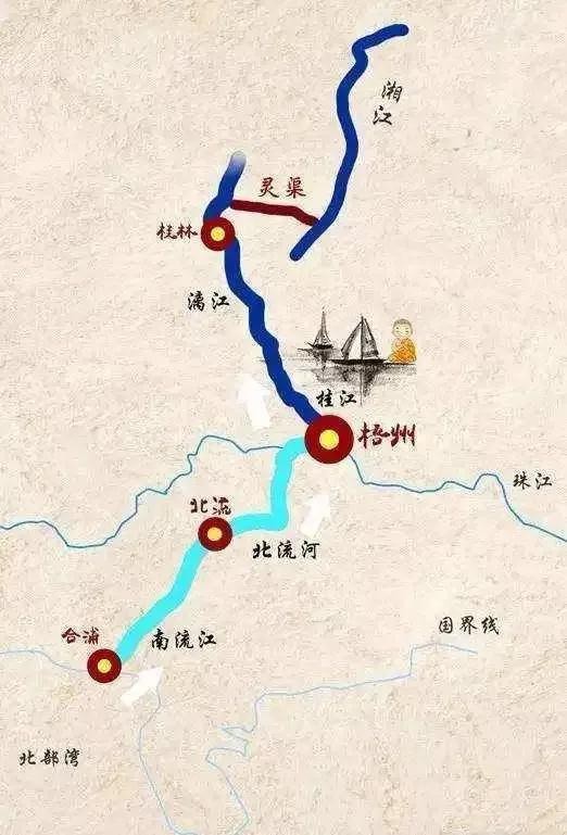 我们来模拟一下,从西安也就是古代的长安出发,水陆路到长江渡口码口出发,到了洞庭湖,沿着湘江下来,经灵渠,进入了广西的漓江,然后到桂江,然后到了梧州的浔江。然后再进入北流河,到到了北流河码头,转陆运到了南流江福绵渡口码头,然后沿南流江南下到合浦港出海,这就是古代的海上丝绸之路了,之前的番国朝贡也都是这么走的,有一点,北流河与南流江是不相通的,最短的是相隔6公里这样,所以,到了北流河码头就得转陆运下到福绵渡口码头,经鬼门关,也就是今天玉林与北流交界的天门关。慢慢的这条水路,包括合浦港,日益繁荣,南流江与北流河,每天都是热闹非凡,官员商人,出发打仗的将士,还有流放的,赶考的,旅游的,和尚僧侣云海的,出出进进南流江,带动了地方周边的商业配套的发达。后来到了唐朝,后面,船越造越大,北流河和南流江都受不起那么大的船,那么多船经过,湘江浔江漓江都是往广州方向直接入海,不用经转陆运,河道又大,慢慢的广州港的崛起,慢慢的就取代了合浦港,使广州港成为了南方重要的第一大港。
