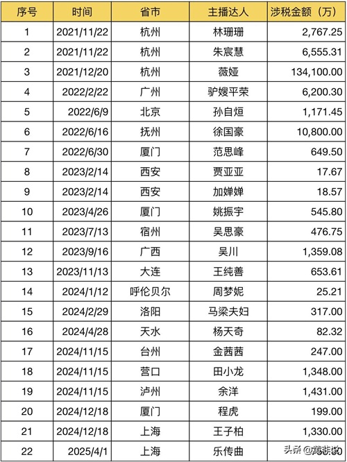 从2021年林珊珊和朱宸慧偷逃税案以来,到2025年4月1日乐传曲,共有22名主播被税务总局全网通报(不含北京税务局通报司马南),合计补缴税费17.1亿,人均7,775万,是的,你没有看错:人均7,775万!