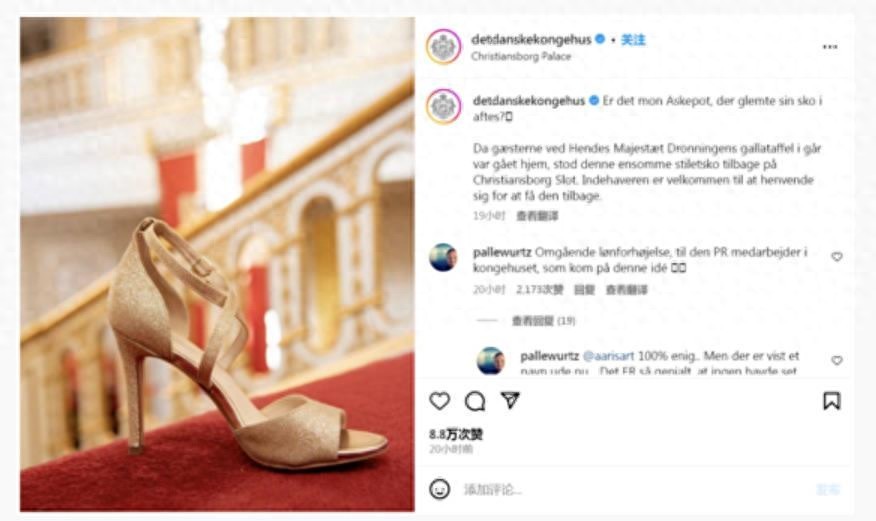 然而,这个童话般的故事并不仅限于宴会和庆祝,它的高潮发生在庆典结束后。当工作人员在清理宴会场地时,发现了一只金光闪闪的高跟鞋,仿佛童话故事中的水晶鞋。第二天,丹麦王室在社交媒体上发布了这只高跟鞋的照片,呼吁失主与他们联系取回。这一事件引发了全球网友的好奇和关注。