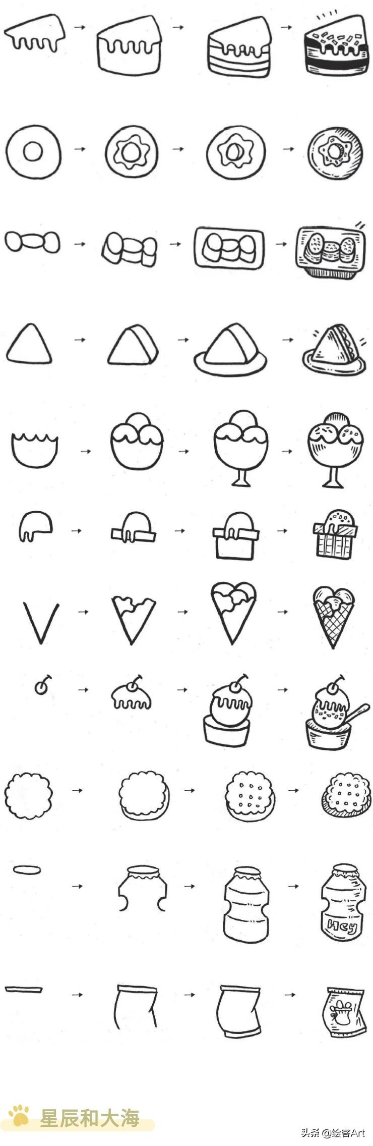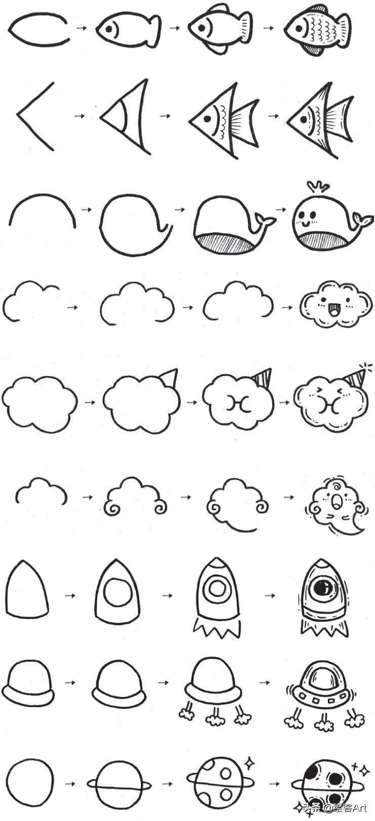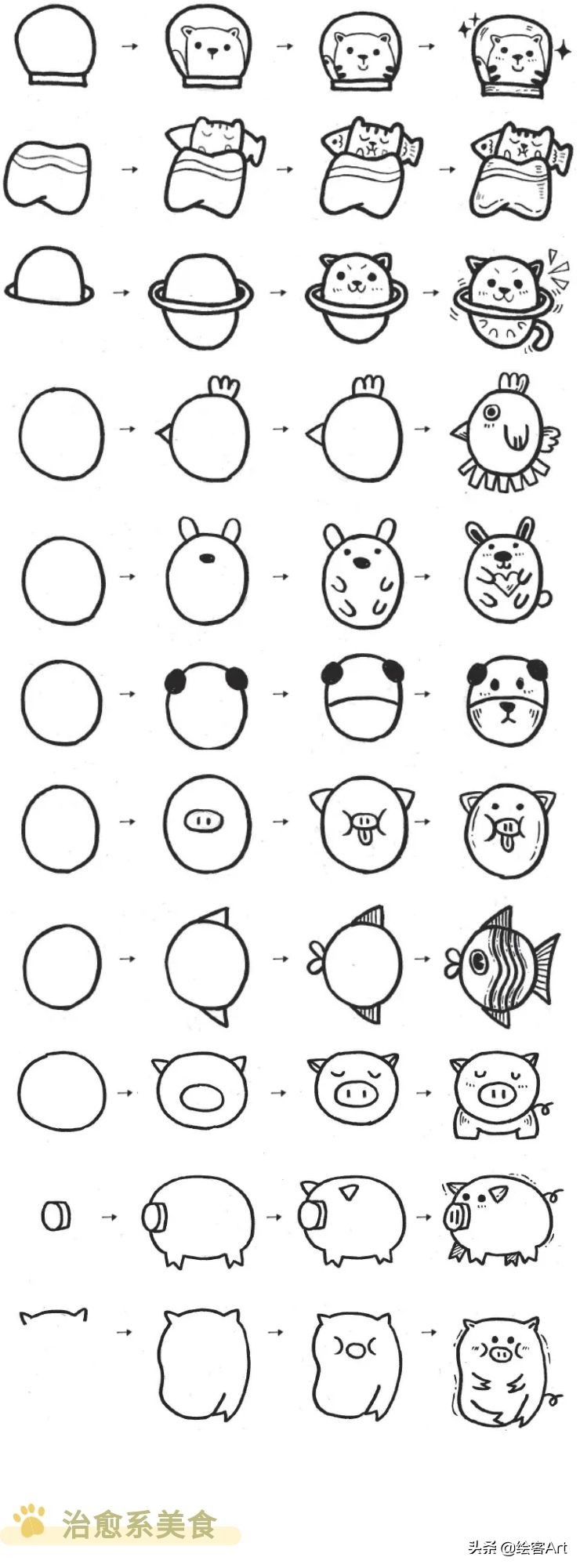 4步就能完成的涂鸦风简笔画,教你画动物、美食、星辰和女生头像