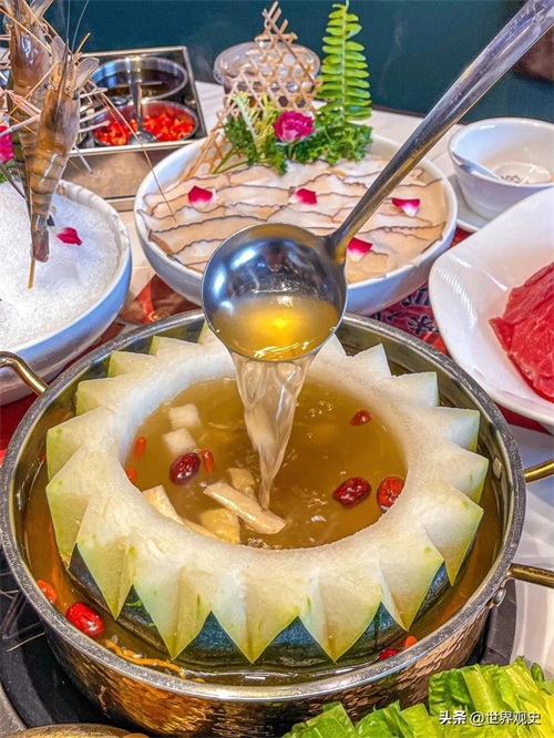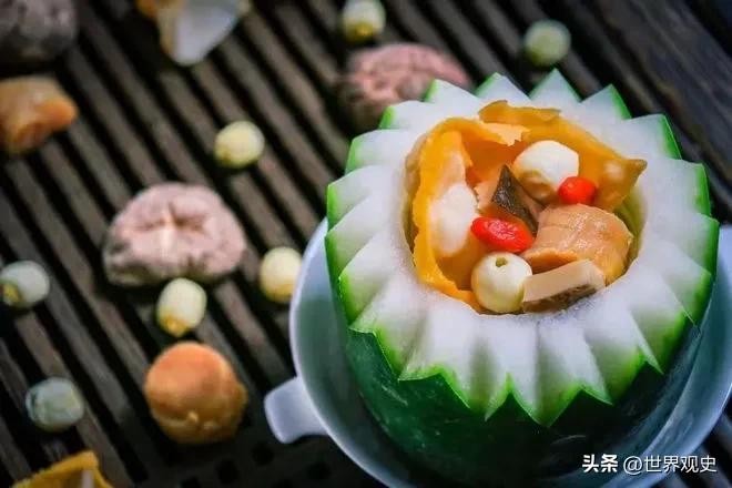 10、八宝冬瓜盅是一道色香味俱全的特色名菜,属于粤菜系。此菜汽清色白,冬瓜肉鲜嫩柔软,味清香,是夏季时令汤菜。将整个冬瓜洗净,沥干水分,随后切取一端,呈茶盅状,挖去瓤子,蒂部削平,口部周围切锯齿纹,口朝上摆放在碗中。此菜汽清色白,冬瓜肉鲜嫩柔软,味清香,是夏季时令汤菜。