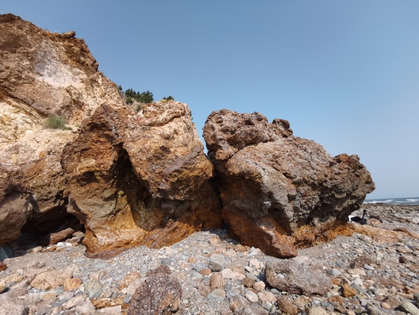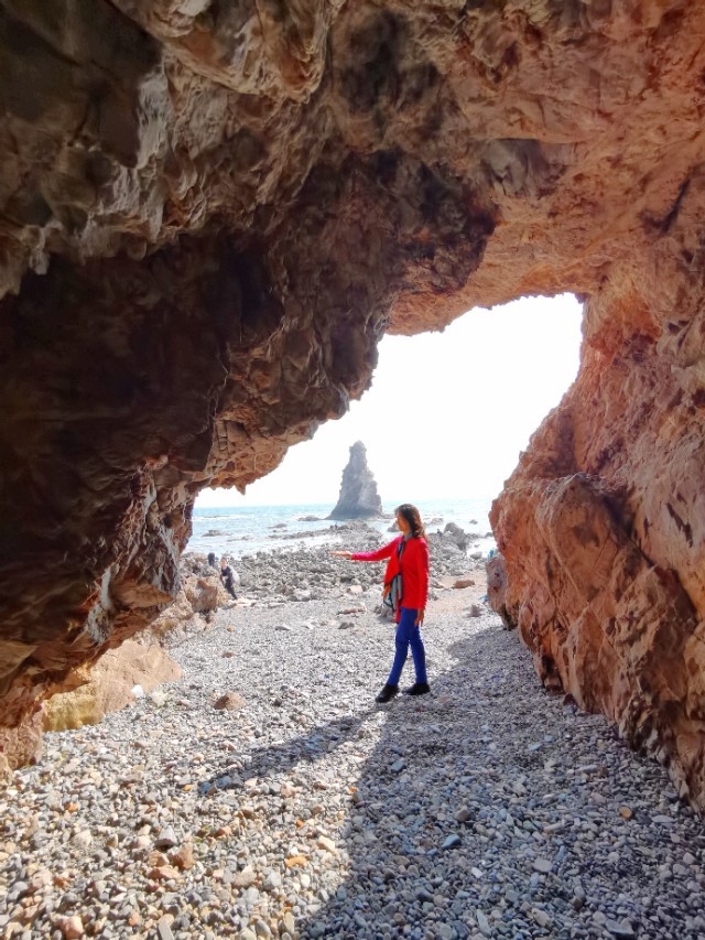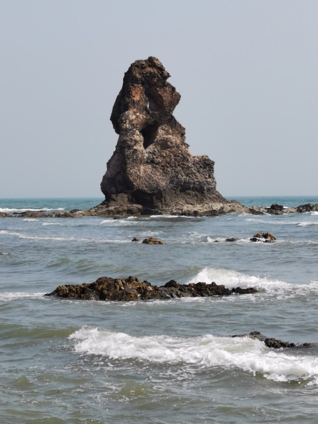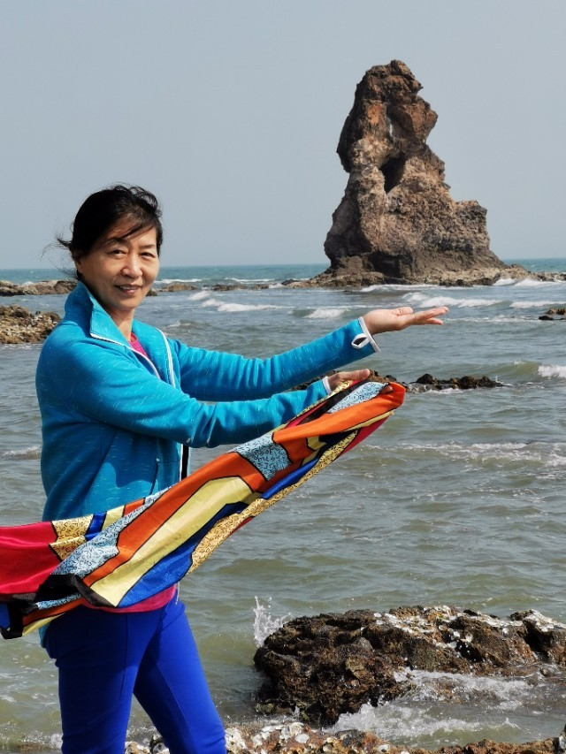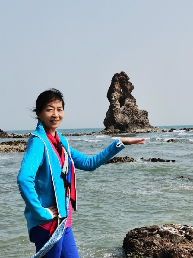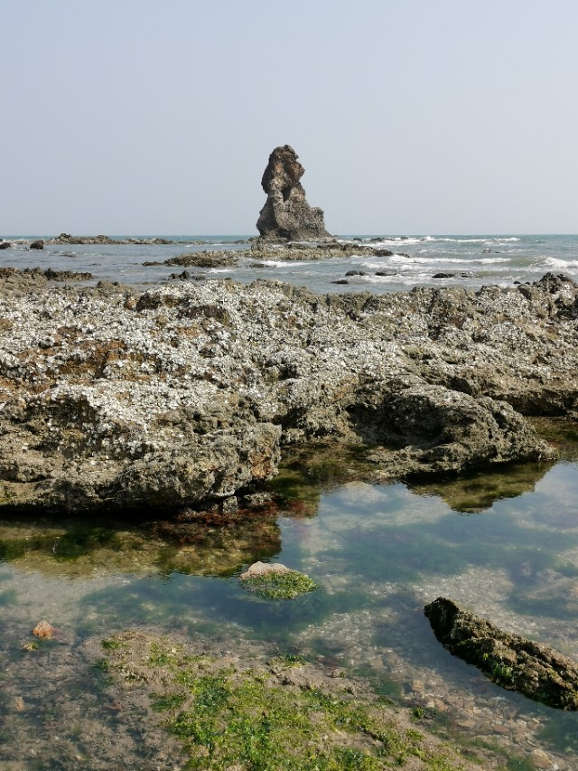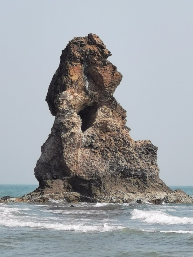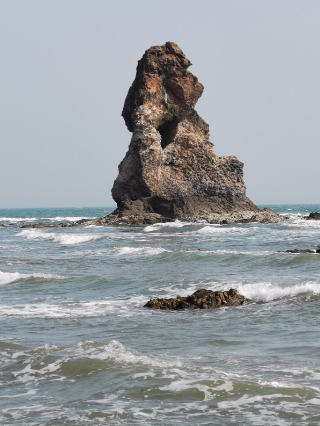 “石老人”海滩上有一个石洞!从这个石洞拍照远处的石老人”听有人说曾经在网上走红!于是我们找到这里,有一波拍照婚纱照的刚刚走,于是我们便进来拍照,效果很好,富有诗意!大家来“石老人”都发现这个石洞没有啊?我估计知道的不多吧!因为,要不是有拍照的站在这里,这个石洞,既是你走到这里,也不容易被发现。因为,石洞很浅,没有往里延伸,就好像是一块大山石挖进去了!