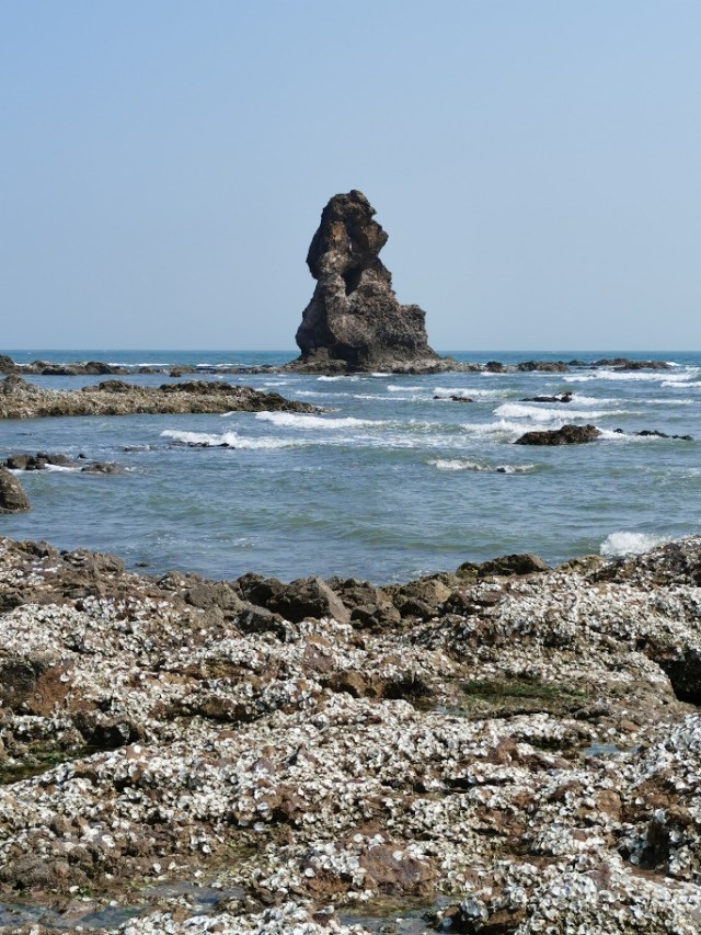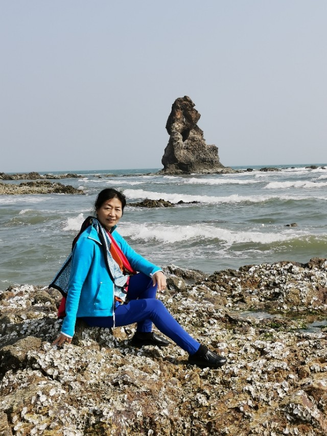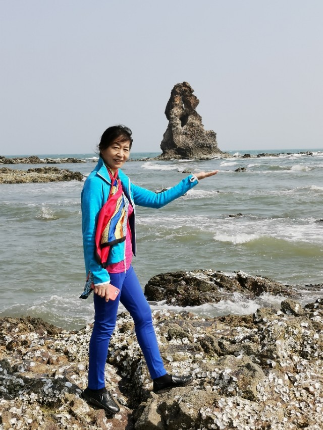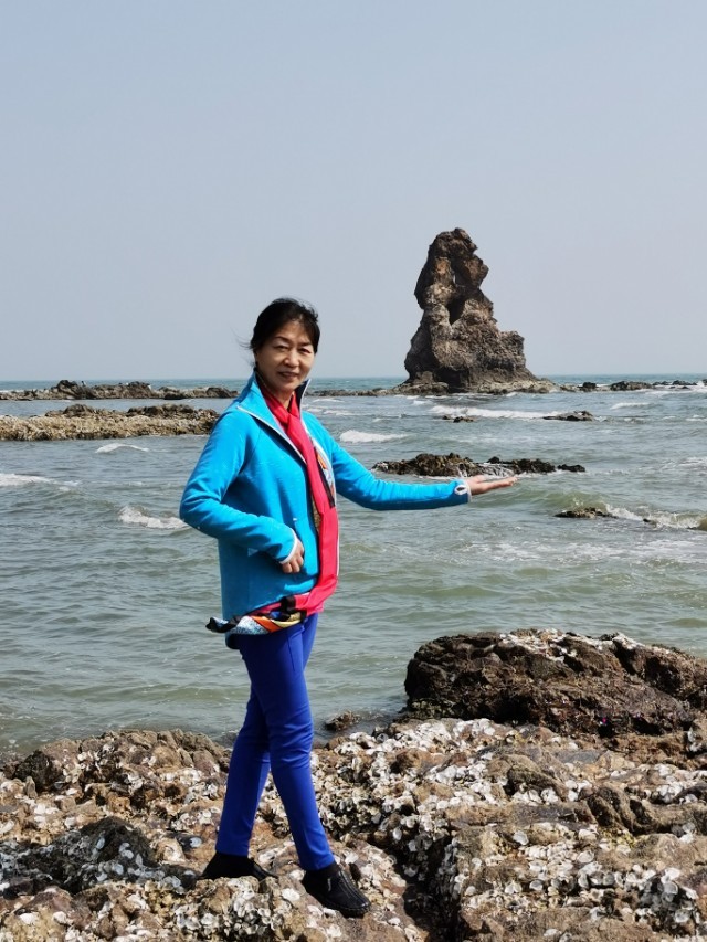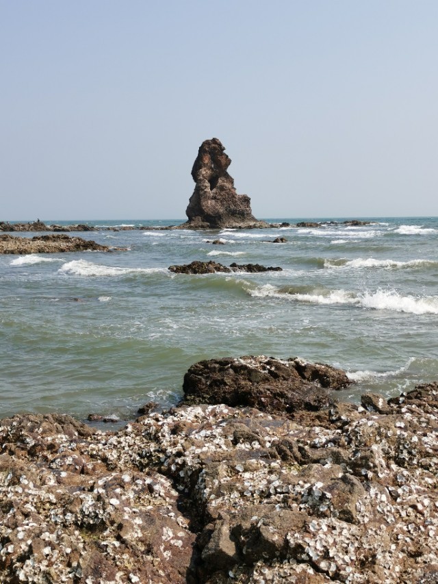 看看这就是“石老人”!青岛东部海边上最著名的一块石头!像一位老人屹立在海边上!它还有一个美丽的传说!这是遇到了退大潮,又是天气好,下午二点多太阳正好西晒在“石老人”的正面,所以是最好的拍照时机!要是天气不好,不退潮和上午来这里,你是拍不清楚“石老人”的!