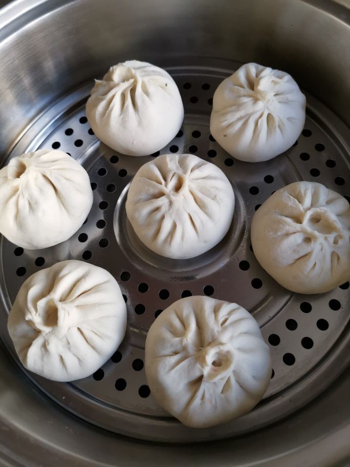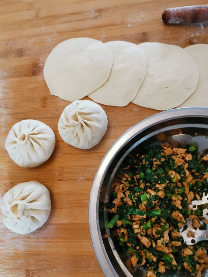 下剂、擀皮、包馅。盖上保鲜膜二次醒发10分钟。