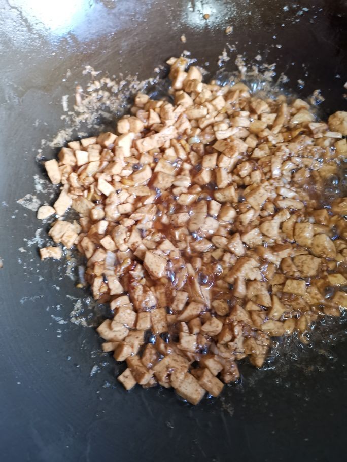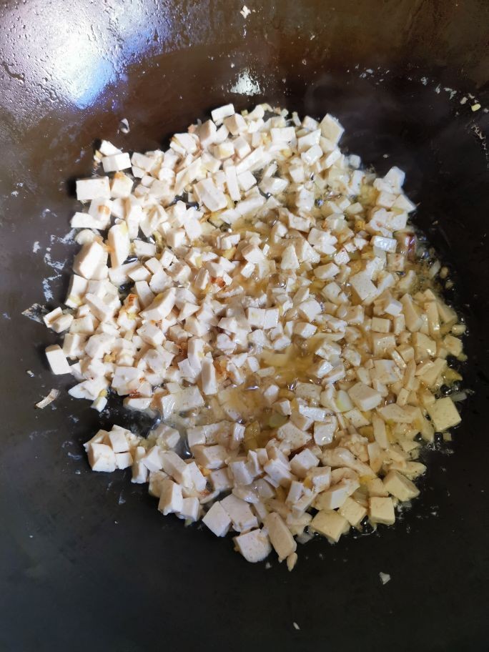 3、起锅放油(油要多放点,因为萝卜樱比较喜油,一会拌馅时就不用再放了),油热后放入葱、姜爆香,放入切好的豆腐丁煸炒。