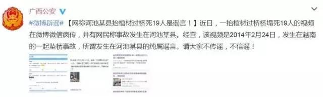 此外,广西壮族自治区公安厅官方微博“@广西公安”也对传言进行了澄清,称“该视频是2014年2月24日发生在越南的一起坠桥事故,所谓发生在河池某县的纯属谣言。”