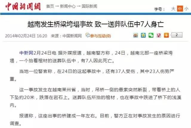 小妹查了好久的资料,终于知道了这个视频说的是什么事情,这是2014年发生在越南的一件事情,根据中国新闻网的报道,2014年2月24日,越南莱州省一支送葬队伍当天早上运送一口棺木过桥途中,吊桥突然坠落,当时,吊桥一侧的悬索突然断裂,带着桥上的人下坠约20米,跌落在岩石上。在这起事故中,7人死亡,37人受伤,其中23人伤势严重。