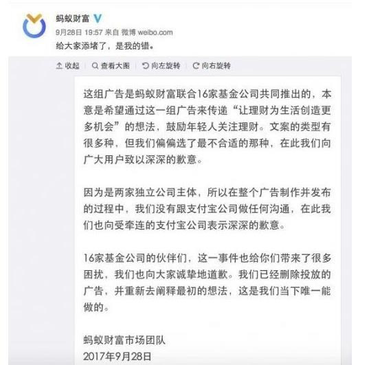 9月28日晚,蚂蚁金服旗下理财平台“蚂蚁财富”就“扎心文案”发布致歉公告称,这组广告是蚂蚁财富联合16家基金公司共同推出的,本意是希望通过这一组广告来传递“让理财为生活创造更多机会”的想法,鼓励年轻人关注理财。蚂蚁财富表示,文案的类型有很多种,但其偏偏选了最不合适的那种,故此向广大用户致以歉意。