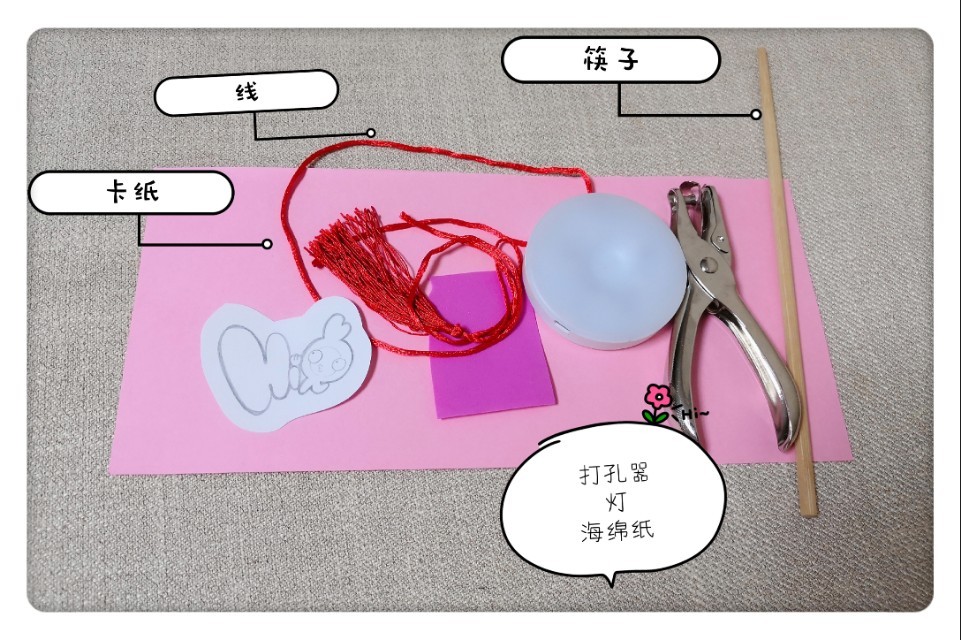 卡纸两张(A4)、双面胶、打孔器、线、剪刀、彩笔、流苏坠子、海绵纸、小灯、一根一次性筷子。