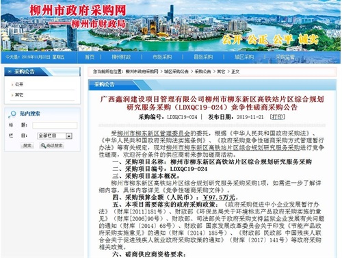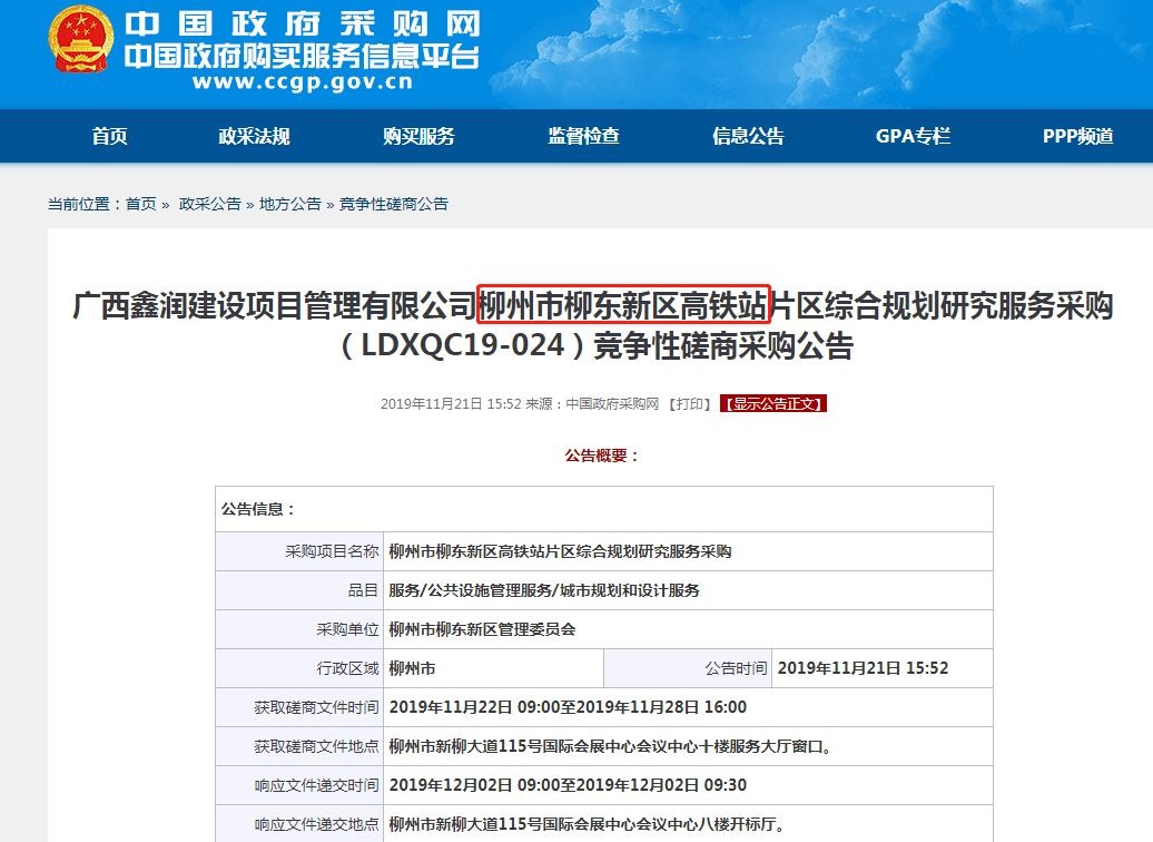 《柳州市柳东新区高铁站片区综合规划研究服务采购公告》